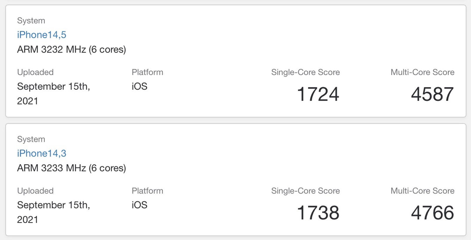 L’iPhone 13 Pro, identificato come “iPhone14,2” da Geekbench, nei test Metal segna un punteggio di 14216, superiore del 55% rispetto ai 9123 punti ottenuti nei test Metal su iPhone 12 Pro.