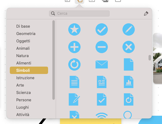 L’opzione Forme consente di richiamare forme base (linee, cerchi, archi, frecce, ecc), oppure elementi grafici divisi per categorie (geometrie, oggetti, animali, alimenti, arte, scienza, ornamenti, ecc.); forme ed elementi grafici sono elementi vettoriali che è possibile ingrandire e modificare a piacimento (si possono anche convertire al volo curve in linee orizzontali o verticali e viceversa).