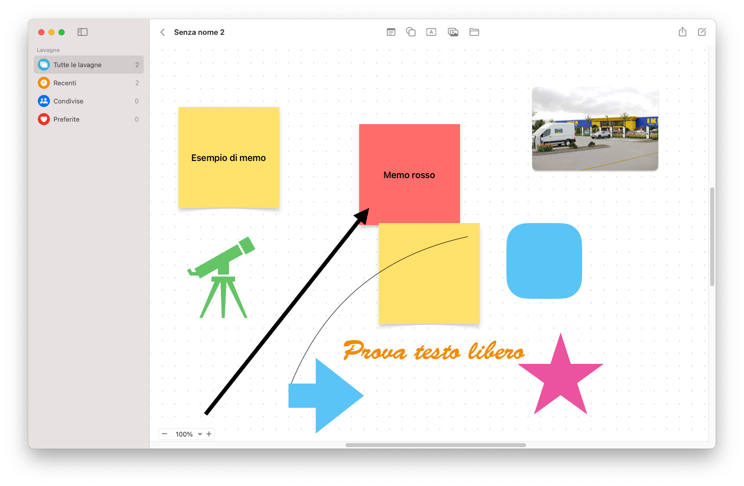 L’opzione Memo crea una sorta di post-it colorato nel quale è possibile scrivere; di default il colore del memo è giallo ma è ovviamente possibile cambiare colore, font, caratteristiche tipografiche, allineamento, ecc. Il memo può essere ingrandito e ridotto con il mouse (o trackpad), eliminato premendo il tasto “Backspace”, spostato, duplicato, ecc. con i consueti comandi standard nei vari programmi.