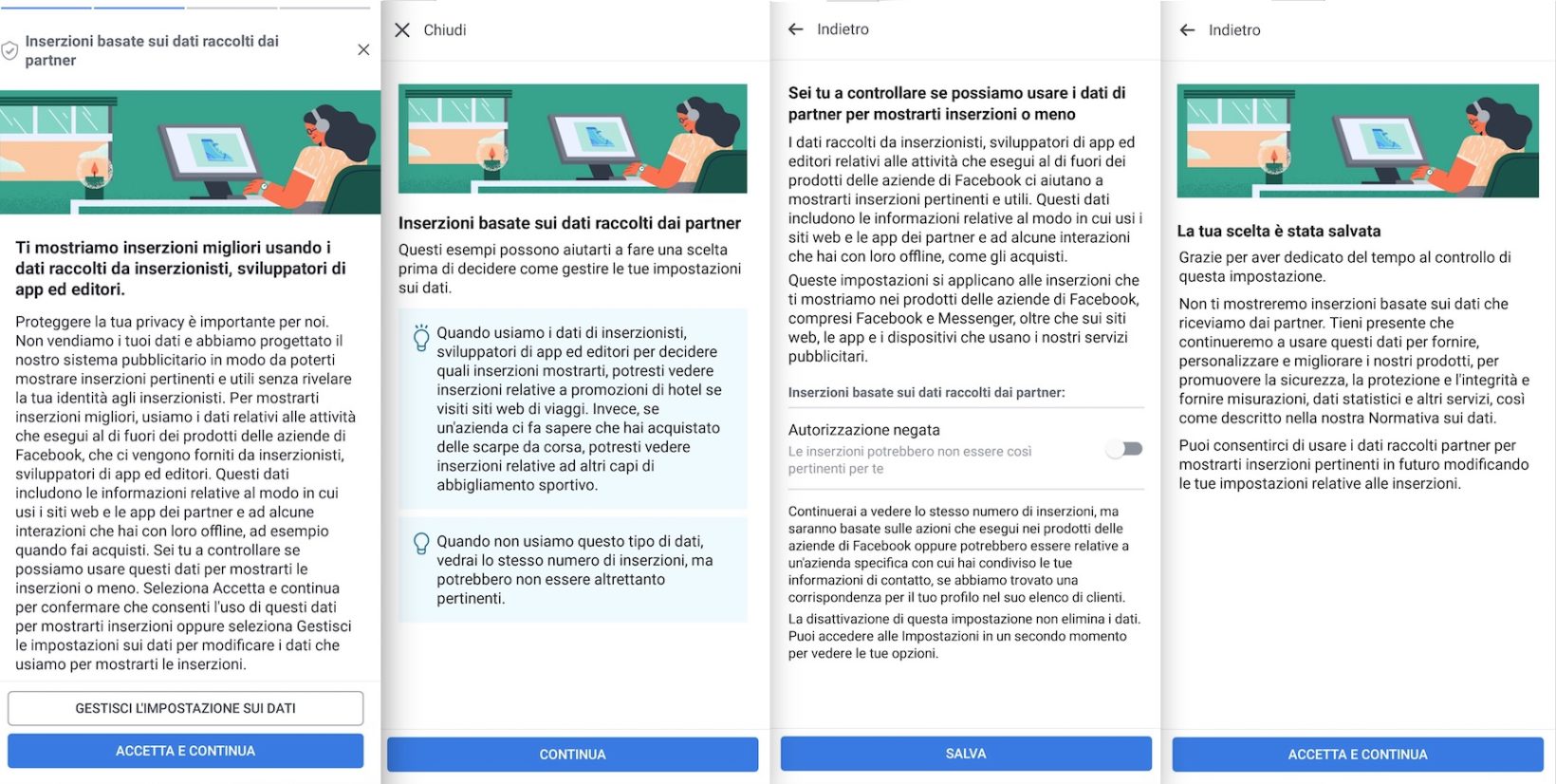 Il secondo passaggio, invece, riguarda le inserzioni pubblicitarie che vengono visualizzate dall’utente. In questo caso, si potrà decidere se autorizzare la raccolta di dati in modo tale da visualizzare le pubblicità in base ai dati raccolti da inserzionisti, sviluppatori di applicazioni ed editori relativi alle attività che l’utente esegue anche al di fuori dei prodotti delle aziende di Facebook.