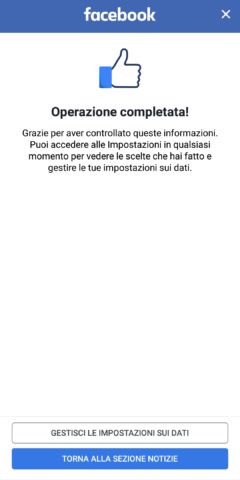 Al termine del tutorial, l’utente potrà cliccare sul banner “Torna ala sezione notizie” per poter continuare ad utilizzare Facebook come prima.