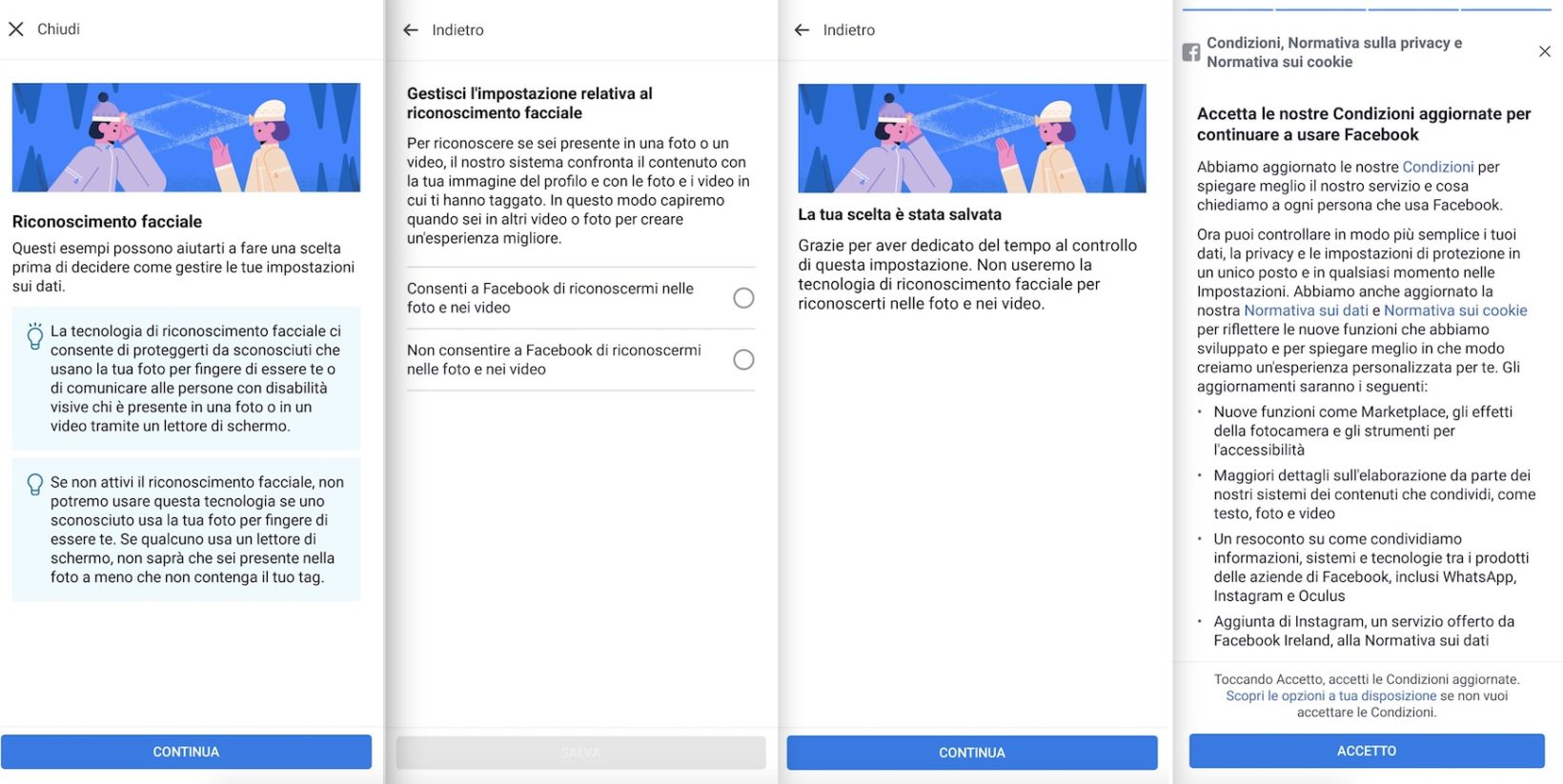 Terzo passaggio fondamentale riguarda il riconoscimento facciale. Attivando questa impostazione Facebook utilizzerà la tecnologia di riconoscimento facciale per capire quando l’utente è presente nelle foto, video o nella inquadratura della fotocamera. Quando l’utente deciderà di attivare questa funzione Facebook raccoglierà ed elaborerà i modelli del volto per proteggere l’utente da eventuali sconosciuti che potrebbero avergli rubato l’identità. Nel caso in cui l’utente deciderà di non attivare riconoscimento facciale, Facebook non traccerà il volto e non potrà utilizzare la propria tecnologia per capire se uno sconosciuto sta utilizzando la propria foto.