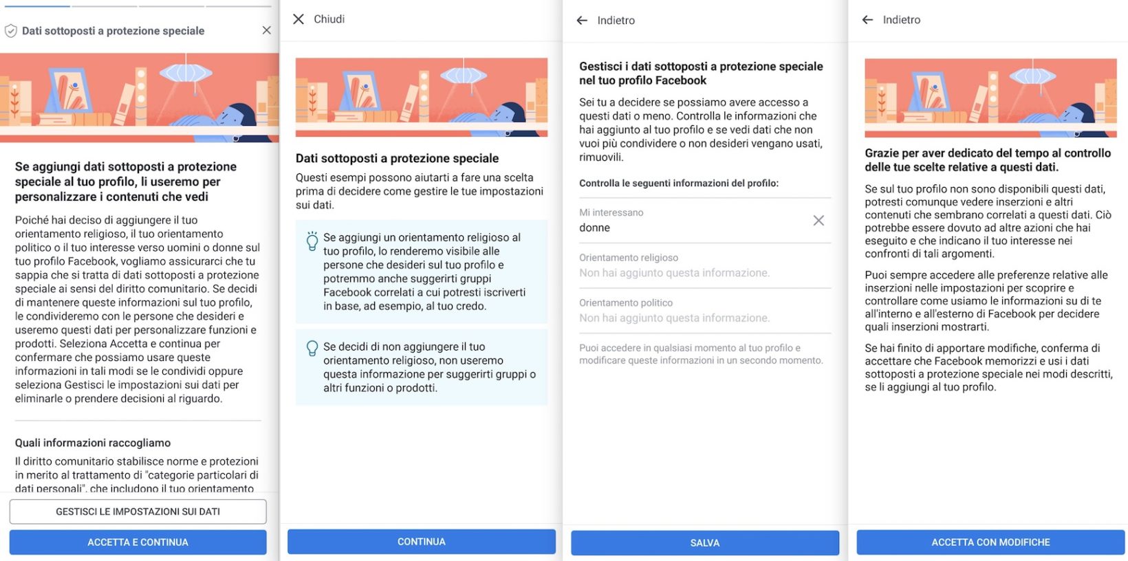 Il primo step riguarda i dati sul proprio orientamento religioso, politico o sessuale. Facebook informa gli utenti, nel caso in cui avessero deciso di inserire queste informazioni sul proprio profilo, che si tratta di dati sottoposti a protezione speciale ai sensi del diritto comunitario. Nel caso in cui l’utente decidesse di mantenere tali dati sul proprio profilo, Facebook informa che saranno condivisi con le persone desiderate e che la piattaforma utilizzerà questi dati per personalizzare funzioni e prodotti offerti.