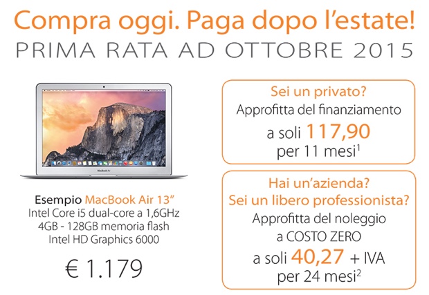 Invece aziende e titolari di Partita IVA possono pagare dopo l’estate, sempre da ottobre, approfittando del Noleggio a Costo Zero. In questo caso, per esempio MacBook Air 13” da 1.179 euro si ottiene versando 40,27 euro più IVA al mese per 24 mesi, una formula conveniente per più ragioni, visto che permette di diluire nel tempo il costo dei nuovi computer e dispositivi Apple e allo stesso tempo di scalarli come costi di esercizio mensili, scaricandone anche l’IVA.