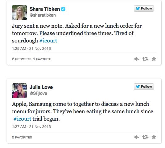 La giuria non ha ancora deciso la nuova sanzione per Samsung ma nel frattempo avrebbe chiesto alla giudice Lucy Ko, di cambiare il pane a lievitazione naturale usato nei sandwich inviati a pranzo. La richiesta scritta è evidenziata per ben tre volte con le parole “per cortesia”, stando a quello che riferisce un divertito articolista di The Wall Street Journal che, scherzando sulla faccenda, addita il cibo finora fornito come “colpevole di monotonia”. In realtà più che il pane a lievitazione naturale le richieste da parte dei giurati sembrano dovute a un semplice fatto: per tutta la durata del processo sembra siano stati distribuiti gli stessi identici panini per pranzo.