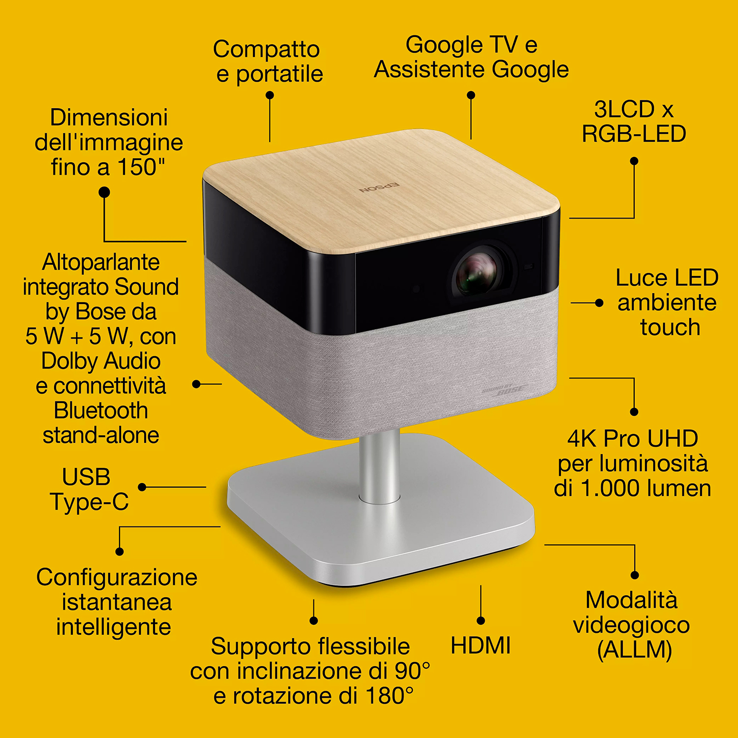 Epson ha annunciato i primi videoproiettori smart dotati della tecnologia Sound by Bose. Sono prodotti eleganti, portatili con ottica ultracorta, e vantano caratteristiche di alto livello, incluso un sistema audio progettato su misura e sviluppato in collaborazione con Bose. Sono inoltre dotati di Google Assistant e Google TV per facilitare la ricerca e lo streaming, oltre che di comode e pratiche opzioni di connessione.