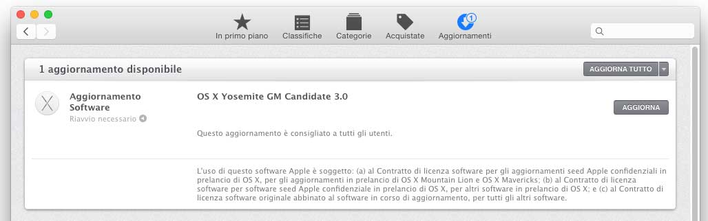 Apple ha rilasciato agli sviluppatori e ai beta tester la terza Golden Master di OS X 10.10 Yosemite (versione che dovrebbe essere del tutto identica a quella che sarà poi rilasciata pubblicamente). La nuova release è identificata con la build “14A388a”, arriva a pochi giorni di distanza dalla precedente e dalla quinta beta pubblica. Quasi nulla sembra cambiato: Apple potrebbe aver avuto la necessità di correggere bug minori, individuati in questi giorni. Anche queste release sarà testata e non è detto sia questa la versione che corrisponderà alla definitiva: si chiamano “release candidate” giacché sono per l’appunto candidate a diventare tali.