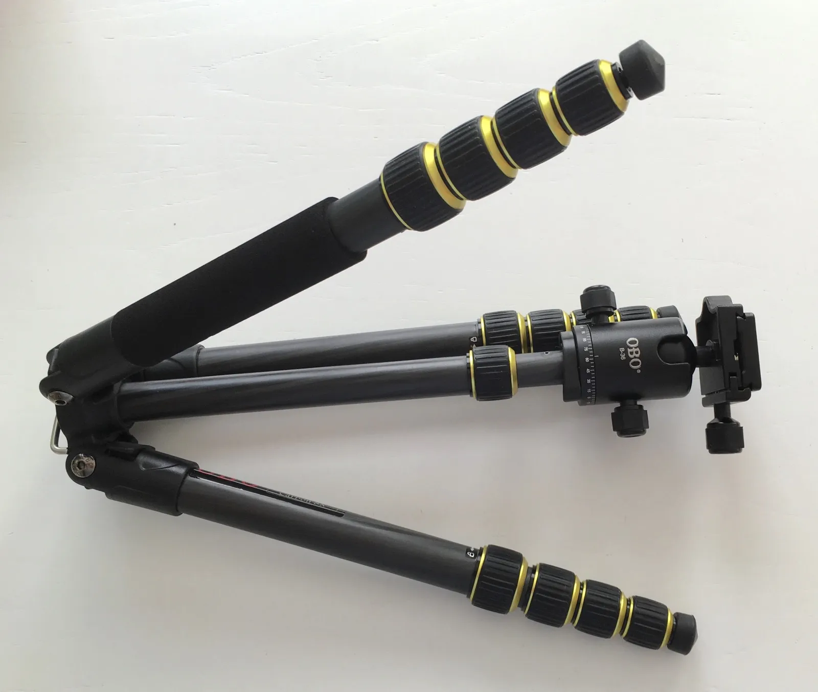 Un cavalletto da viaggio dovrebbe essere allo stesso tempo leggero e comodo ma non dovrebbe farci rinunciare alla stabilità e alla versatilità. E così dovendo scegliere tra la marea di proposte rintracciabili sui cavalletti di produzione Cinese disponibili su Amazon abbiamo optato per questo TS 360C di Andoer Obo (93 euro su Amazon) che in realtà viene venduto con sigle alquanto diverse ma è riconoscibile per diversi fattori: ha una testa ruotabile a 360° con rotazione, attacco rapido e messa in bolla con pure la bussola, un piede che una volta svitato diventa un monopiede, una finitura in uno strano colore oro-verdino e, sopratutto, un peso ridottissimo (vista la conclamata realizzazione in carbonio) che è stato il nostro primo criterio di scelta.