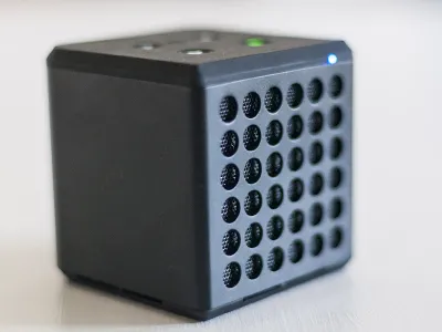 Fuori dalla scatola, che nella sua semplicità è comunque una certa dose di originalità, il piccolo si apre con una dose minima di componenti: il diffusore vero e proprio è accompagnato dal cavo Micro USB per la ricarica e da un piccolo libretto di istruzioni valido più che altro per capire il funzionamento dei pulsanti e il pairing Bluetooth. Nei suoi sette centimetri e mezzo di lato il Cube ospita tutto: nella parte frontale trova posto la griglia del diffusore con i suoi 36 cerchi che nascondono una griglia interna più fitta, mentre altre aperture per il diffusore si aprono anche nei diversi lati, nella parte sotto. Appena dietro, in alto, lo switch di accensione è posto a lato del connettore Micro USB e del mini jack audio per l’ascolto analogico.