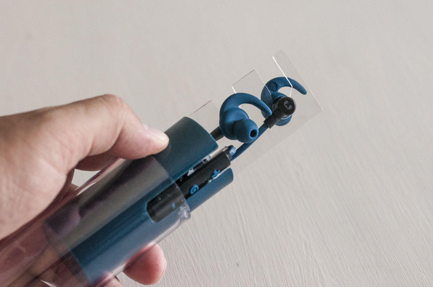 La prima cosa che ci è saltata all’occhio è la forma della scatola delle cuffie, quando le acquistate in negozio o vi arrivano a casa dall’acquisto su Amazon. Un piccolo cilindro di plastica trasparente racchiude tutto, in un magico incastro che, una volta sciolto, è impossibile da ricomporre. Nella confezione trovano posto le cuffie vere e proprie, un set di cuscinetti e archetti in gomma per l’adattamento ai vari padiglioni, un cavo di ricarica MicroUSB e un cavo MicroUSB/miniJack di cui parleremo dopo.