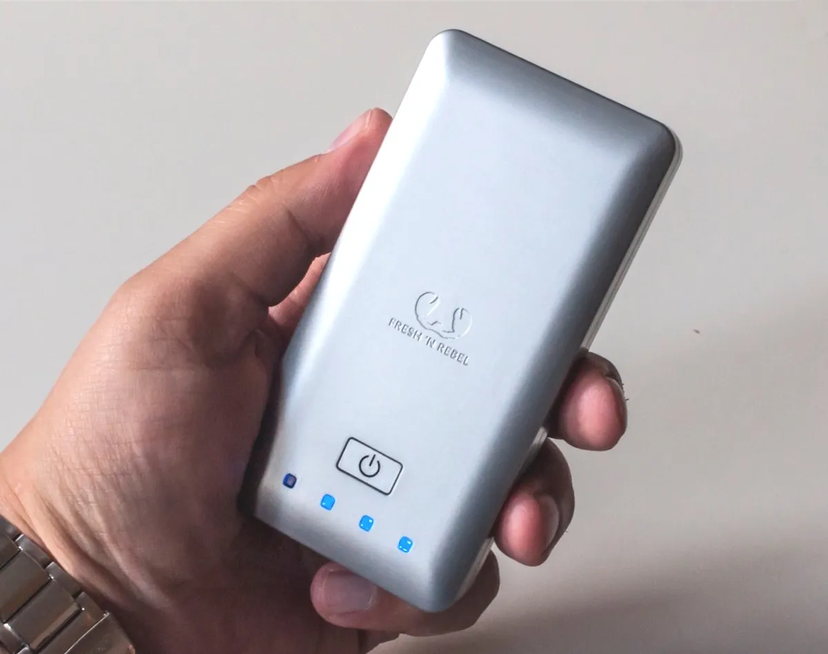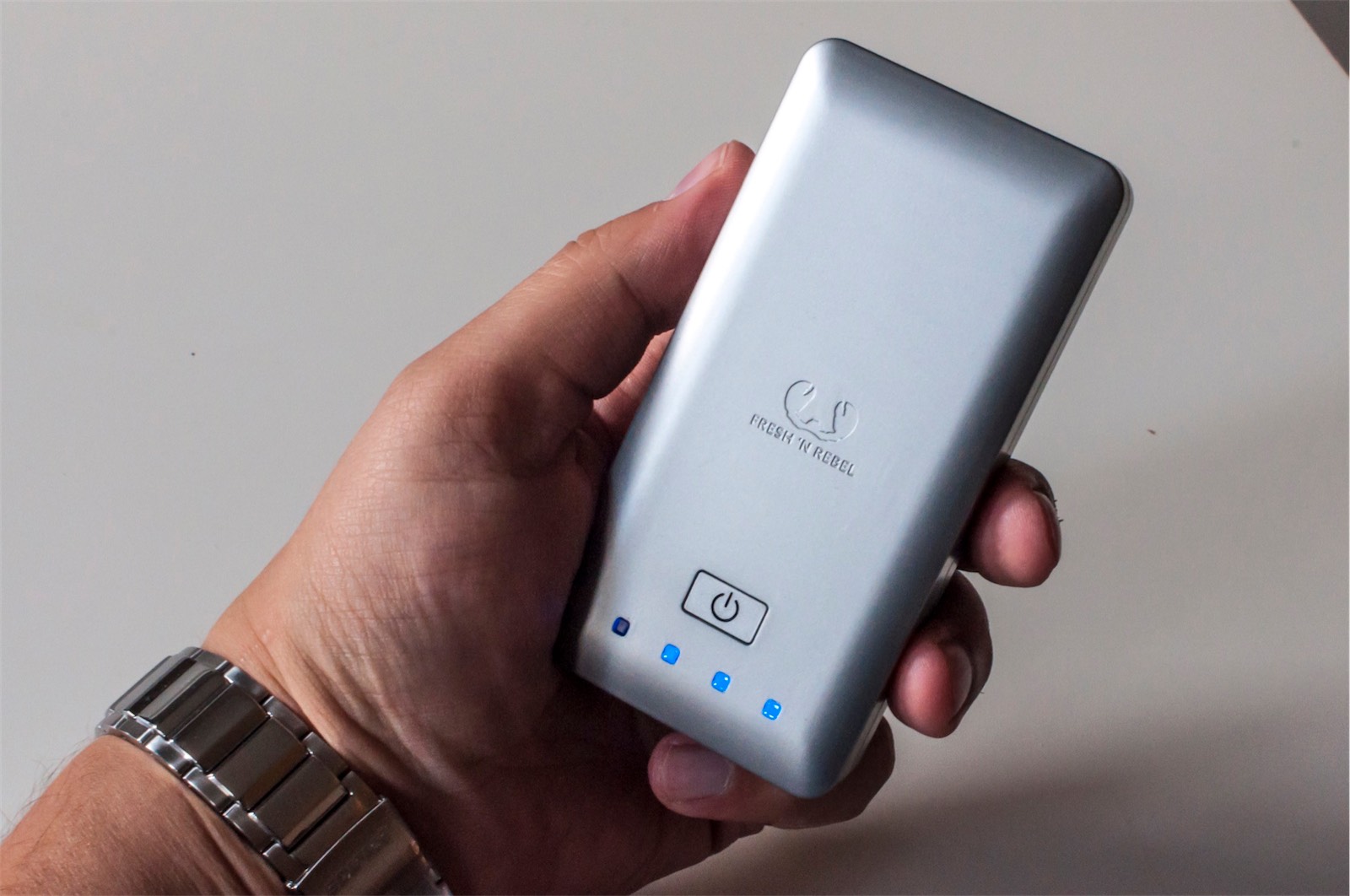 A prima vista il modello di Fresh’n’rebel appare in modo un po’ anonimo, perché racchiuso in una scatola di plastica grigia: esaminandolo da vicino troviamo due prese USB per la ricarica dei device e una MicroUSB per la ricarica della batteria. La parte superiore mostra cinque LED che indicano la quantità di carica residua e il pulsante Power che, oltre che attivare l’erogazione di energia vera e propria, indica anche il funzionamento. Le dimensioni sono vicine a quelle di un pacchetto di sigarette e come tale sta bene nelle borse di computer, sfruttando le tasche per il mouse o per i cavi. Anche il peso, di poco superiore ai 200 grammi non incide più di tanto durante il trasporto, ed è di poco superiore ai modelli anonimi con metà della carica che si trovano in commercio.