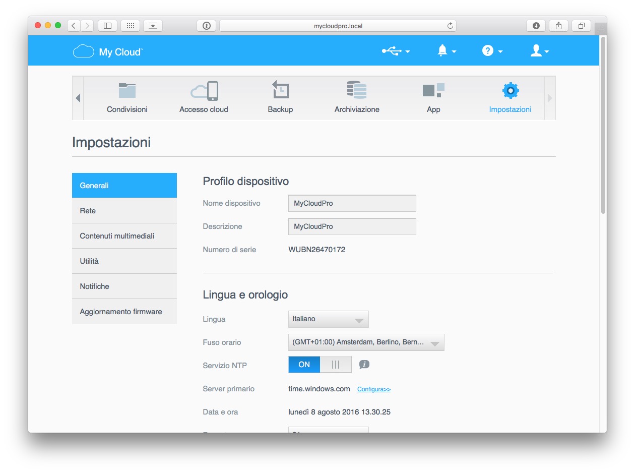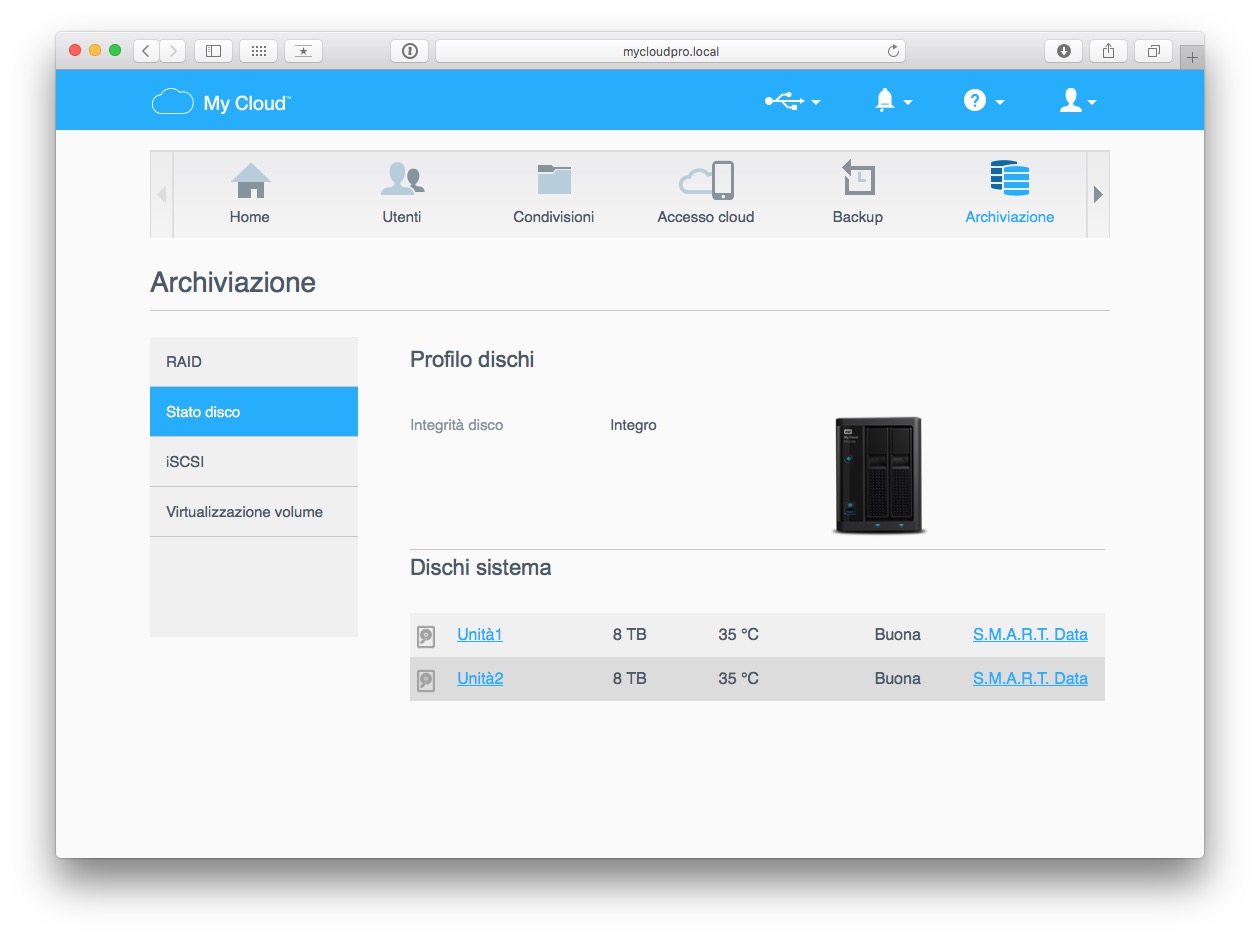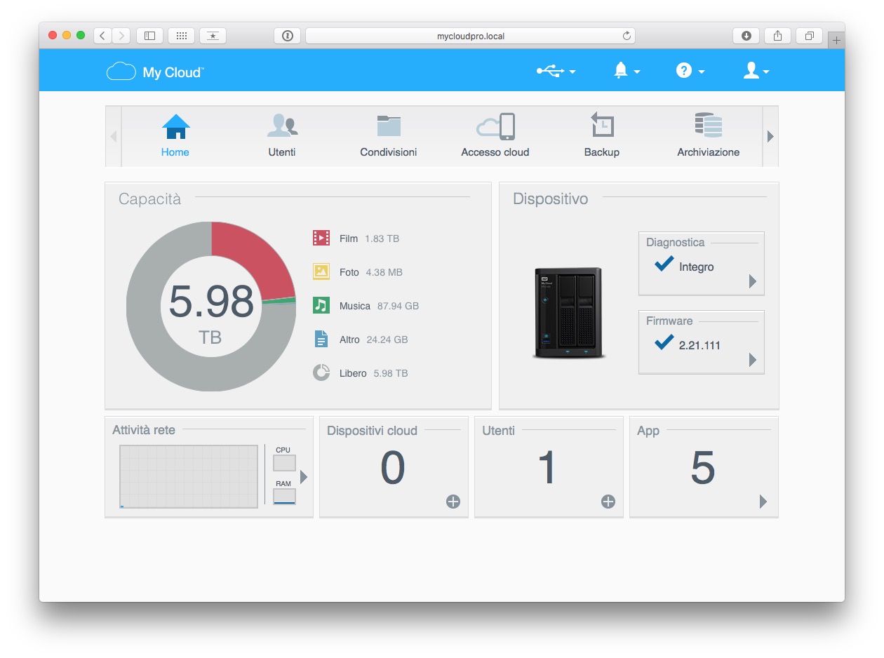 La parte migliore del MyCloud Pro è senza dubbio la parte software: pensato per essere un dispositivo per tutti, la configurazione e mantenimento del disco sono davvero un gioco da ragazzi. Durante il primo collegamento si definiscono i parametri di base, come il primo utente e le funzioni di rete, poi per il resto tutto è gestito tramite browser, compatibile con Bonjour.