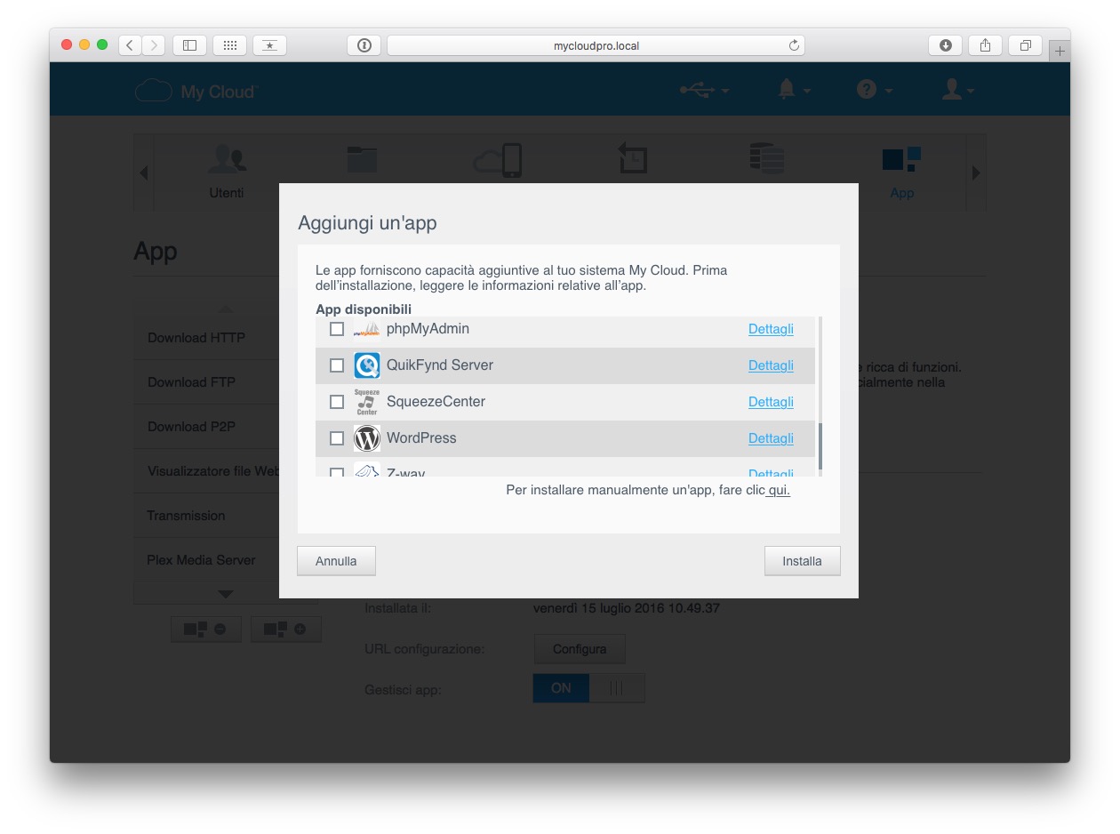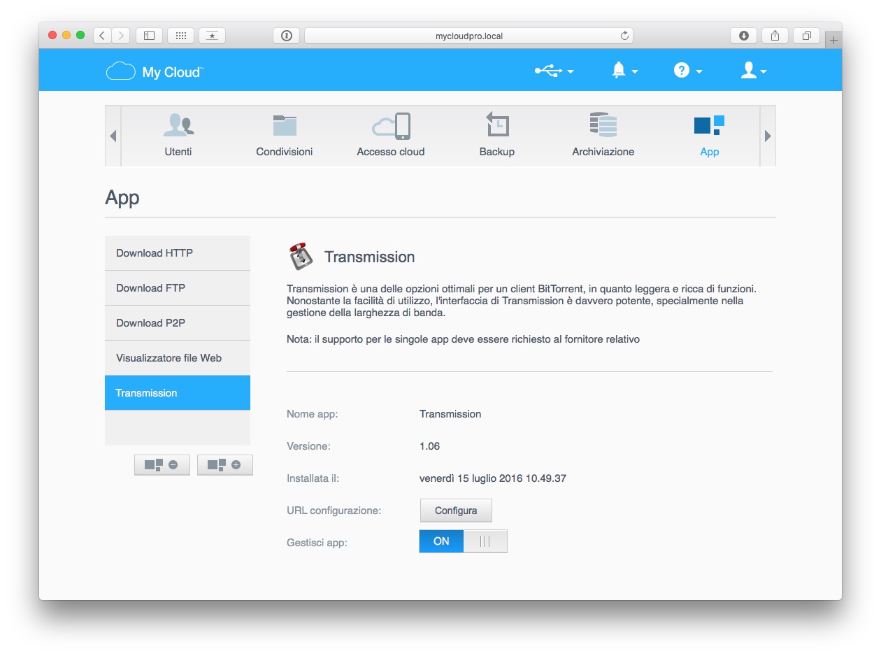 Alcuni servizi sono integrati, la condivisione tramite AFP, WebDAV, SMB, iTunes Server e TimeMachine per il backup di rete, anche su cartelle distinte, per il resto c’è la possibilità di utilizzare App esterne. Per queste c’è un piccolo App Store che vede la presenza di alcuni nomi noti come Plex, Dropbox, aMule, Transmission, Joomla e WordPress più altri più dedicati ma che possono diventare davvero un ambiente molto utile per chi sviluppa.