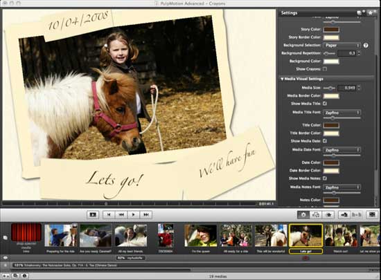 Pulpmotion Advancedd è un software per la creazione di presentazioni professionali e accattivanti. E’ possibile incorporare i propri video, la musica e le immagini preferite. Caratteristica interessante del software è la possibilità di accedere alla propria libreria multimediale (iPhoto, Aperture, LightRoom) in modalità full screen. Una timeline consente di conoscere la data in cui è stata scattata una foto o girato un video e impostare precisamente musiche o effetti sonori da avviare.