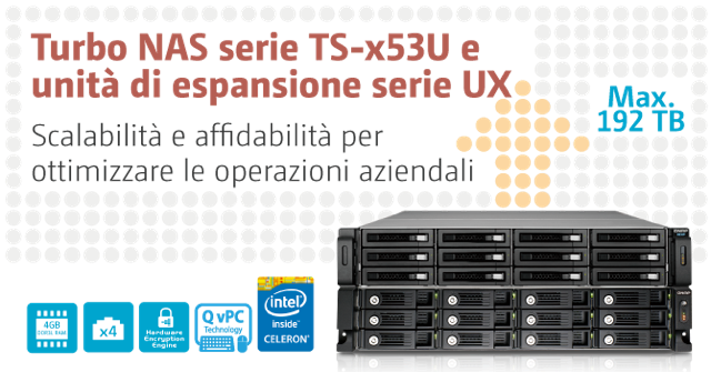 La gamma TS-x53U è caratterizzata da processori Intel Celeron quad-core da 2.0GHz (2.41GHz burst speed) a basso consumo energetico con 4GB di RAM DDR3L (espandibili a 8GB), quattro porte di rete Gigabit LAN con prestazioni fino a 400MB/s. Lo spazio di archiviazione può essere ampliato utilizzando le unità di espansione QNAP (in versione 12-dischi UX-1200U-RP o in versione 8-dischi UX-800U-RP) per arrivare ad una capacità totale di 192TB (TS-1253U-RP in abbinamento all’unità di espansione UX-1200U-RP).