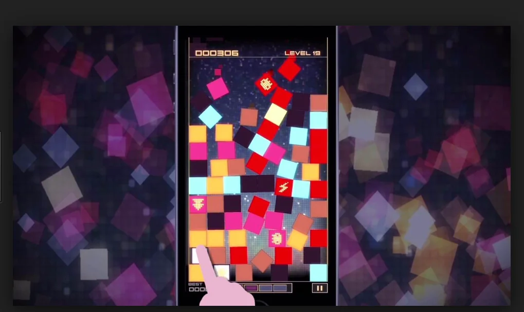 Sembra facile, ed in effetti lo è, ma il numero di quadrati che invade la scena è talmente tanto elevato, che risulterà impossibile resistere per più di qualche minuto. La velocità con cui si riempie la griglia è maggiore di quella con cui si riesce a far esplodere i quadrati colorati a schermo. Questi, come in un qualsiasi Tetris, cadono dall’alto, in ordine casuale e andranno a impilarsi liberamente sulla griglia di gioco, seguendo le regole della fisica e della gravità. Il giocatore, allora, dovrà cercare di far esplodere i quadrati presenti a schermo per liberare la scacchiera ed evitare che si riempia completamente. Per selezionare i quattro quadrati dello stesso colore, e generare così la combo esplosiva, sarà sufficiente toccarli, oppure eseguire slide senza rilasciare il dito dal display.