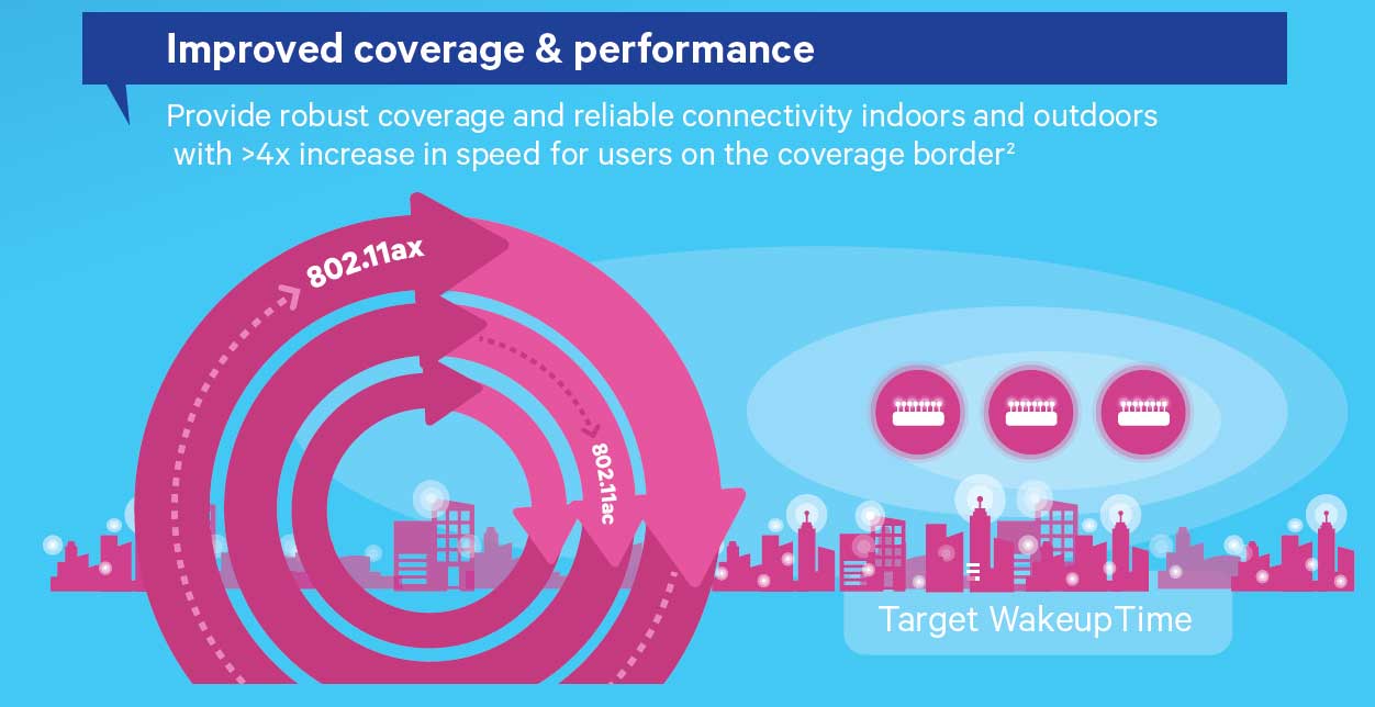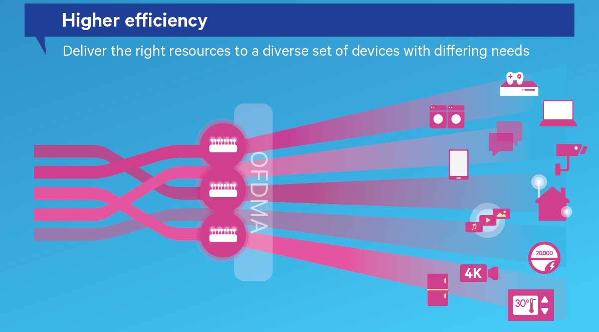 Tre le tecnologie che consentono questi miglioramenti, la OFDMA (Orthogonal Frequency-Division Multiple Access) che si occupa di gestire gli accessi regolando il traffico in uplink ed evitando i classici colli di bottiglia. A livello energetico la chiave di volta è la funzionalità denominata Target Wakeup Time (TWT) che permette di regolare lo stato di attività dei dispositivi accrescendo il tempo di standby e riducendo l’impatto sulla batteria.