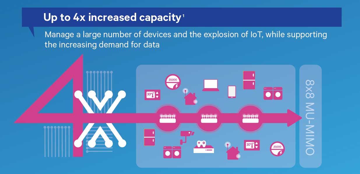 Il chip IPQ8074 supporta la tecnologia MU-MIMO e configurazioni 12×12 (8×8 su frequenza 5GHz, 4×4 su 2.4GHz), per una larghezza di banda complessiva di 4,8 Gbps, un raggio d’azione più ampio rispetto ai chip 802.11ac. È supportata anche una tecnologia (proprietaria) denominata Wi-Fi Self-Organizing Network (SON) che dovrebbe semplificre l’installazione della reti e ottimizza il traffico. Dal punto di vista del client (i dispositivi connessi al router) la gestione è affidata al SoC QCA6290, in grado di offrire throughput quattro volte superiore rispetto alle attuali tecnologie. Anche questo supporta tecnologie MU-MIMO 2×2 e permette di combinare flussi 2.4 e 5GHz sfruttando due bande simultaneamente con la tecnologia Dual Band Simultaneous (DBS) fino a un massimo di 1,8 Gbps. Il consumo energetico è ridotto di due terzi rispetto a connessioni 802.11ac.