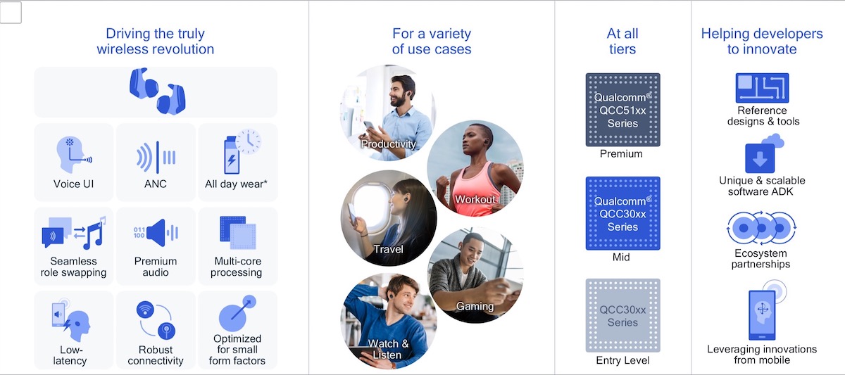 Il SoC Qualcomm QCC514X (dedicato al livello premium) e il SoC Qualcomm QCC304X (dedicato a quello entry-level/medio livello) supportano entrambi la nuova tecnologia TrueWireless Mirroring di Qualcomm, che collega in modalità wireless un solo auricolare al telefono tramite Bluetooth.