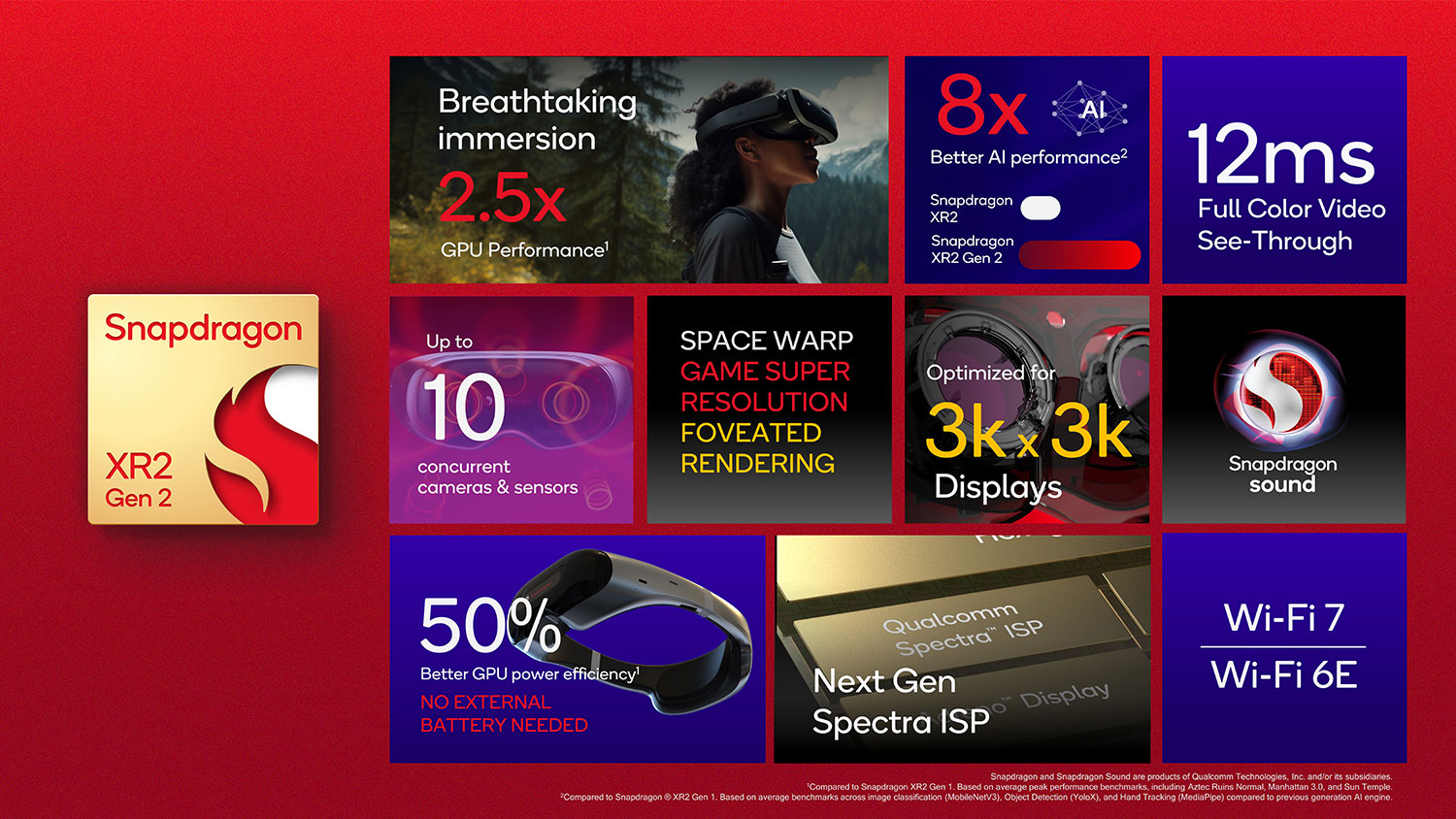 Qualcomm riferisce di prestazioni della GPU 2,5 volte migliori rispetto a Snapdragon XR2 Gen 1, il supporto a un numero maggiore di fotogrammi al secondo, e ottimizzazioni per risoluzioni fino a 3K per occhio.