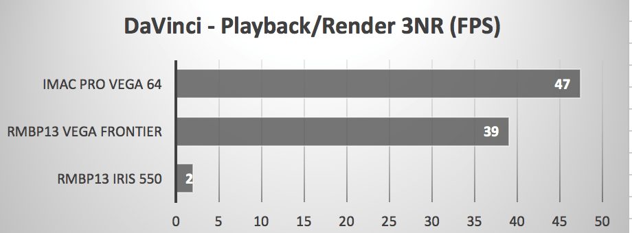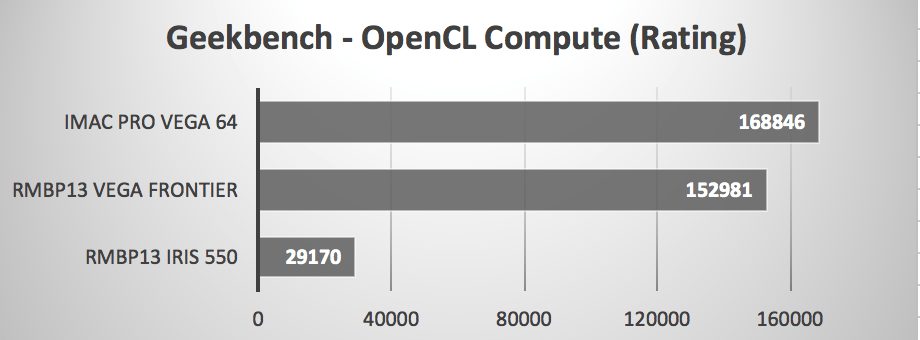 Com’è facile immaginare, tutti i test hanno dimostrato l’enorme guadagno di velocità rispetto alla Intel Iris Graphics. Non si arriva ai livelli di velocità che è possibile ottenere con l’iMac Pro ma certamente il guadagno in termini di prestazioni è notevole.