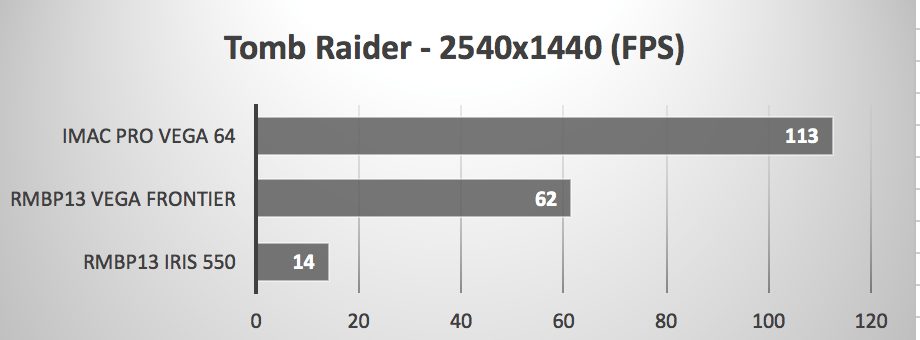 Quanto si guadagna in velocità sfruttando le eGPU? Il sito BareFeats ha fatto delle prove con un MacBook Pro 13″ 2016 che integra la Intel Iris Plus Graphics 550 collegando a questo una eGPU AMD Radeon RX Vega 64. I grafici che riportiamo qui sotto fanno riferimento a: