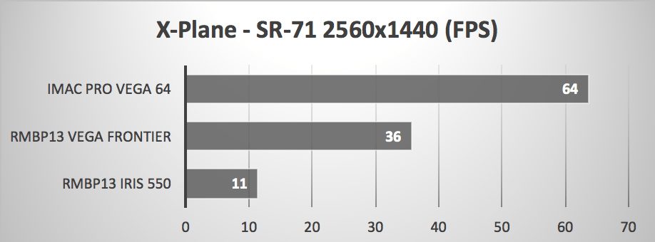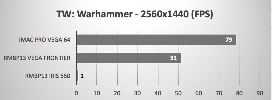 Tutte le prove sono state eseguite con la beta 1 di macOS 10.13.4. I test con DIRT Rally sono stati eseguiti con i preset impostati su “Medium”, risoluzione 2560×1440, opzioni Vsync e MSAA disabilitate. I test con “Total War: WARHAMMER” sono stati eseguiti con i preset impostati su “High”, risoluzione 2560×1440 full screen. I test con X-Plane 11 sono stati eseguiti registrando 2 minuti di volo con l’SR-71 Blackbird, impostando la risoluzione su 2560×1440 full screen e attivando le opzioni “circle view” e “high quality”.