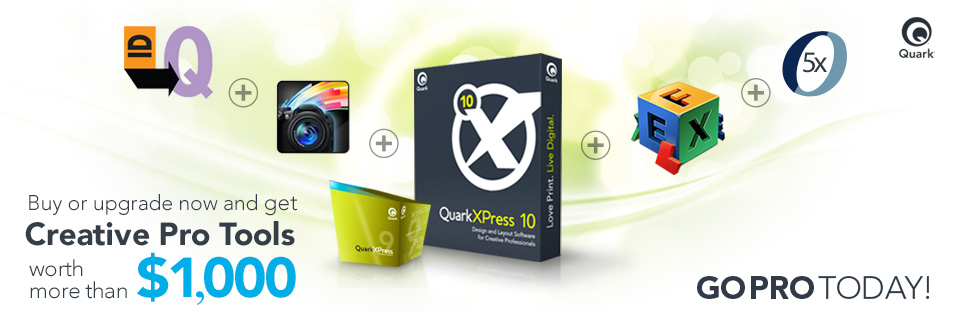 Quark ha annunciato Quark Creative Pro un’offerta valida per un periodo limitato per chi vuole acquistare o aggiornare a XPress 10. Coloro che acquisteranno o aggiorneranno XPress alla nuova versione, riceveranno un bundle di pacchetti aggiuntivi del valore di oltre 1000$.
