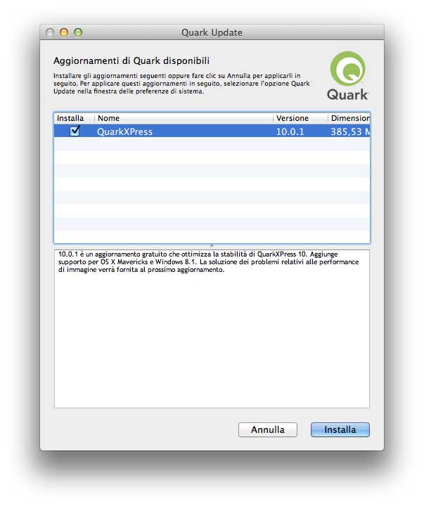 Resta ancora un problema concernente le performance nella gestione delle immagini ma la società fa sapere che questo sarà risolto con il prossimo update. Oltre al supporto a OS X 10.9 sono state integrate migliorie nella gestione dei testi, risolti vari problemi con l’output dei file PDF, con il rendering dei font OpenType, nell’output e rendering di file TIFF e PSD, migliorato il supporto per le trasparenze dei file PDF creasti con Illustrator. L’update di Xpress può essere scaricato selezionando dalle Preferene di Sistema la voce “Quark Update” e da qui cercando e installando gli aggiornamenti al termine del download.
