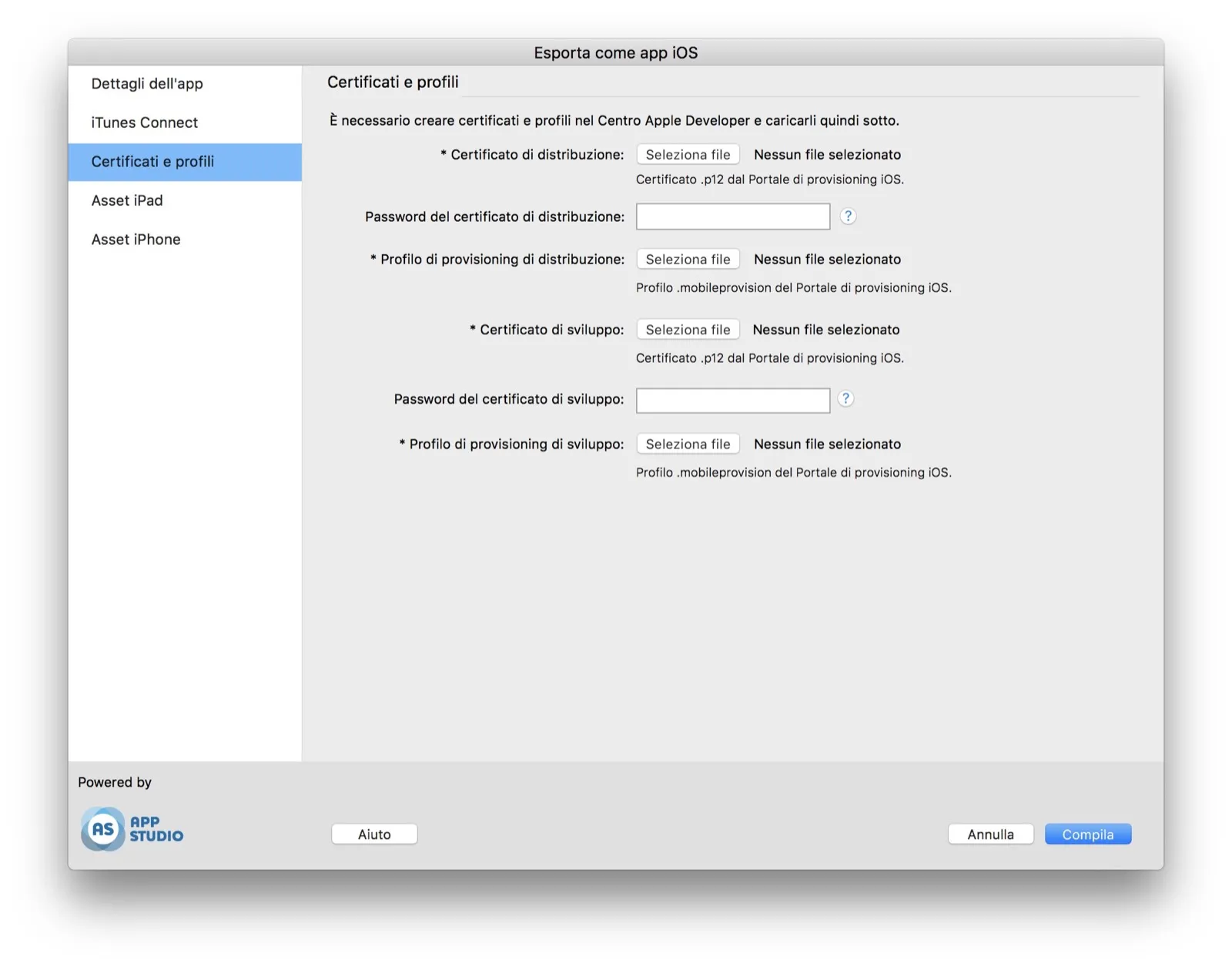 Inoltre, la seconda nota positiva in questo senso è data dal sistema di pubblicazione quasi del tutto automatizzato (per quanto Apple lo permetta): una singola finestra permette l’upload dei certificati e la generazione dell’App sui server di Quark, una fase che taglia di netto tutta la problematica di generazione di una App sul proprio Mac che chiunque abbia provato ricorda con terrore.