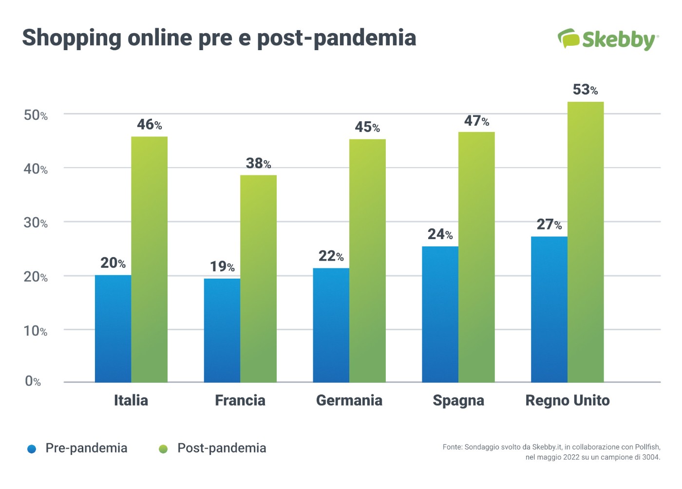 La Germania, infatti, è partita con il 22% delle persone che effettuavano la maggior parte dei loro acquisti online per arrivare oggi al 45%, mentre la Spagna è passata dal 25% al 47%. Il Regno Unito, che dei paesi oggetto dell’indagine è quello dove la propensione verso l’e-commerce è tradizionalmente più forte, è passato, invece, dal 27% al 53%. Il raddoppio della percentuale si è verificato poi anche in Francia, il paese dove l’e-commerce è partito nel 2020 da appena il 19% per arrivare oggi al 38%.