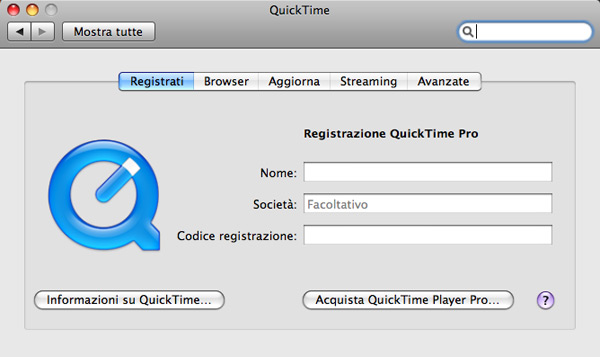 Nella versione attualmente utilizzata da sviluppatori e tester il nuovo sistema operativo della Mela offre una versione di QuickTime completa di tutte le funzioni avanzate da sempre riservate per la versione Pro, come per esempio le funzioni taglia, copia e incolla. Allo stesso tempo le indiscrezioni disponibili online riportano che sono state rimosse le voci di menu per l’acquisto della versione Pro e anche quella per la registrazione del software: stessa sorte è toccata al pannello per la registrazione di QuickTime Pro all’interno delle Preferenze di sistema.
