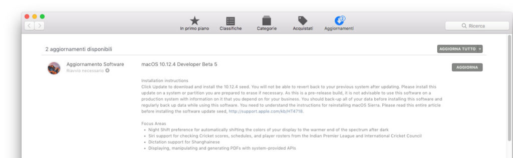 Come sempre l’update può essere scaricato selezionando la voce “Aggiornamenti” dal Mac App Store. Tra le novità dell’update a macOS Sierra 10.12.4 il supporto per “Night Shift”, una modalità (ne abbiamo parlato in dettaglio qui) che può essere attivata e programmata dalla sezione Monitor permettendo – di sera o notte – di impostare automaticamemte i colori dello schermo su toni più caldi, aiutando l’utente a riposare meglio dopo sessioni serali davanti allo schermo. Non mancano ad ogni modo funzionalità “sotto il cofono” come la risoluzione di alcuni bug relativi al “motore” PDF e anche il supporto a processori che dovremmo vedere in futuri Mac.