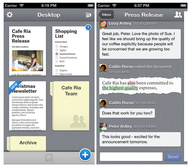 “Il software che usiamo per lavorare non si è evoluto negli ultimi trent’anni; il workflow è ancora fermo agli anni Ottanta”, aggiunge Gibbs. “Nel frattempo i tablet sono diventati parte della vita di tutti i giorni, persino nelle aziende”. Secondo Gibbs, le aspettative degli utenti durante la creazione di documenti su telefoni e tablet sono troppo basse. “Perché non dovrebbe essere facile leggere e scrivere documenti su qualsiasi dispositivo, indipendentemente dalle dimensioni del suo schermo? Perché per molti nuovi servizi basati su cloud la capacità di lavorare offline è ancora considerata un lusso, qualcosa che va abilitato apposta o addirittura acquistato a parte? Abbiamo voluto eliminare tutti questi limiti e creare il primo word processor per la generazione tablet”.