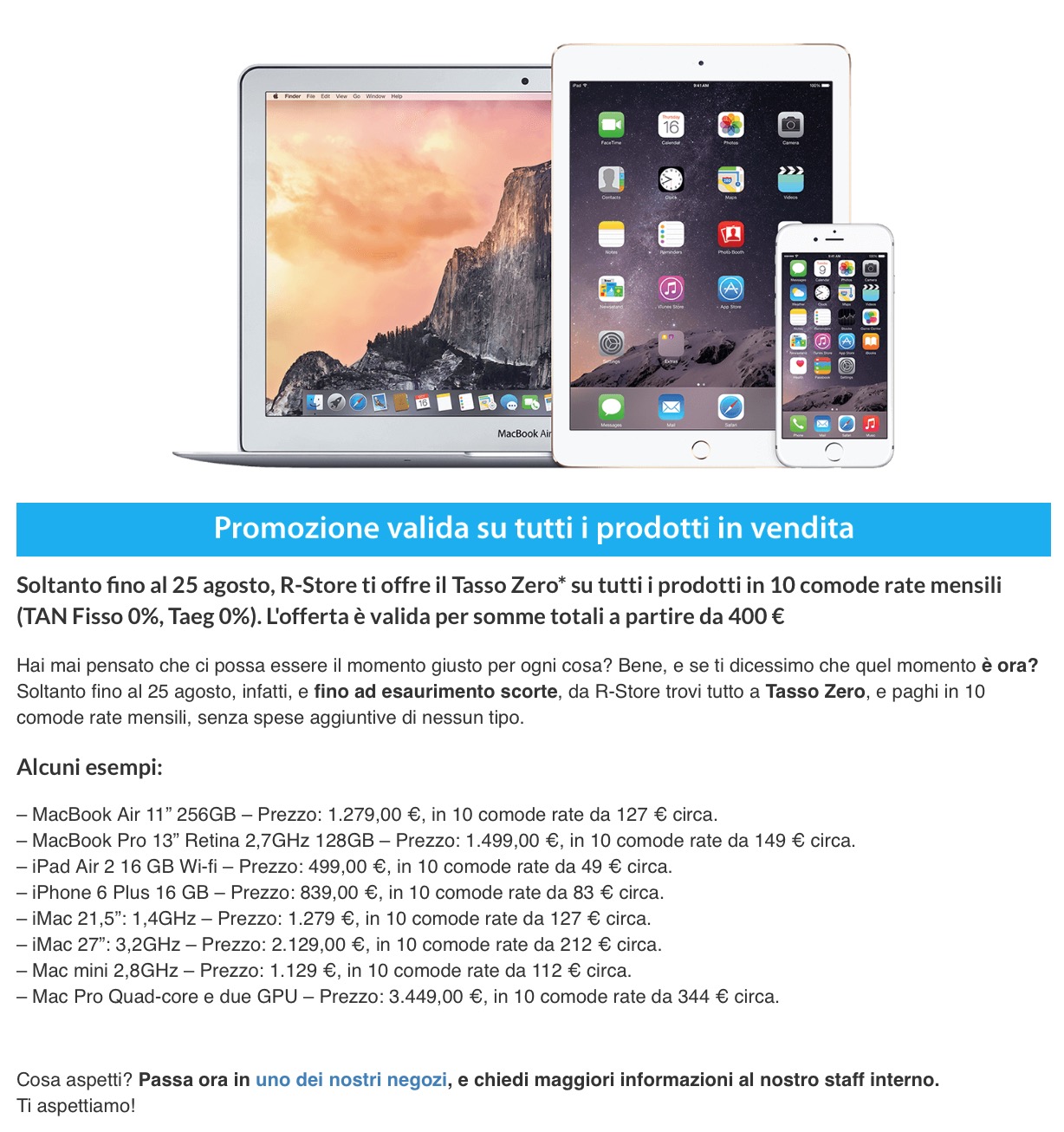 L’offerta è valida per tutti i nuovi Mac, desktop e portatili, nonché per iPhone e iPad, disponibili nei negozi R-Store. Anziché spendere tutto e subito, il pagamento può essere dilazionato nel tempo con 10 rate più piccole grazie al finanziamento a Tasso Zero reale, con TAN e TAEG pari a zero.
