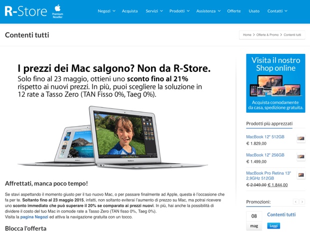 Solo fino a domani nei negozi R-Store i prezzi dei Mac non subiscono l’aumento di listino Apple in più si ottiene il 10% di sconto. Le due iniziative sommate insieme si traducono in sconti che per diversi portatili e desktop della Mela arrivano fino al 21%. A queste iniziative chi lo desidera può abbinare anche il Tasso Zero in 12 mesi per suddividere l’importo totale in rate più piccole spalmabili in un anno.