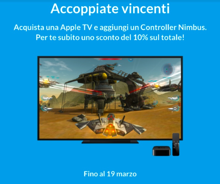 Insomma è l’accessorio perfetto da abbinare ad Apple TV per giocare al massimo sulla grande TV in salotto, inoltre è compatibile anche con iPhone e iPad. Lo sconto del 10% è valido fino al 19 marzo: Apple TV 32GB più il controller Nimbus sono proposti insieme a 215 euro invece di 238,90 euro, mentre lo stesso bundle ma con Apple TV 64GB costa 260 euro invece di 288,90 euro.