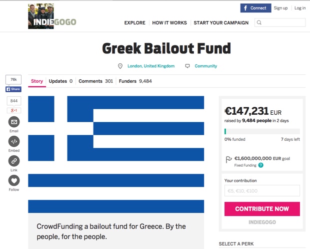Il destino della Grecia e la tenace battaglia politica per arrivare a una soluzione in grado di preservare l’unità europea dominano i notiziari, le prime pagine dei giornali nel mondo, oltre alle preoccupazioni del popolo greco così come degli altri abitanti dell’Unione Europea. Nei giorni e nelle ore più critici arriva un tentativo di salvataggio mai tentato prima: una colossale raccolta fondi su Indiegogo.