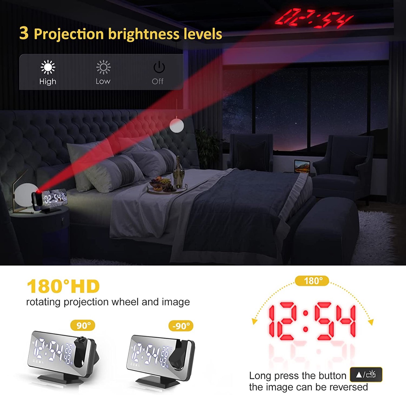 Non è dissimile da altre, quantomeno per le funzioni principali. E’ infatti una radiosveglia FM nella quale possono essere impostati fino a due allarmi per svegliarsi al mattino col proprio programma radiofonico preferito ed è dotata di un proiettore che permette di “stampare” l’ora corrente su qualsiasi parete della stanza: si può infatti inclinare di 180 gradi permettendo quindi di decidere se fissarlo al soffitto oppure altrove, con una luminosità per altro regolabile su tre diversi livelli in modo da adattarne la visibilità in base all’illuminazione della stanza.