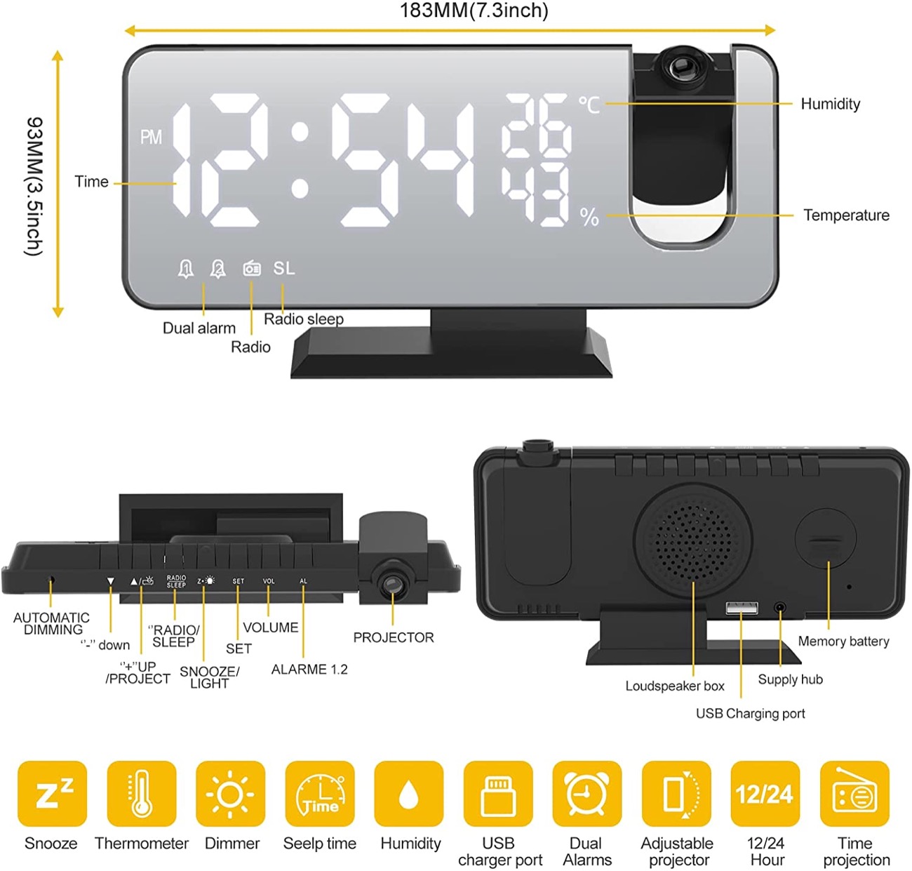 Diversamente da molte radiosveglie di questo genere però presenta una superficie frontale a specchio – che riflette quindi la stanza in cui si trova – all’interno della quale vengono poi mostrati l’ora corrente, gli indicatori delle funzioni attive e la temperatura ambientale in gradi centigradi, che viene rilevata attraverso un apposito sensore incorporato.