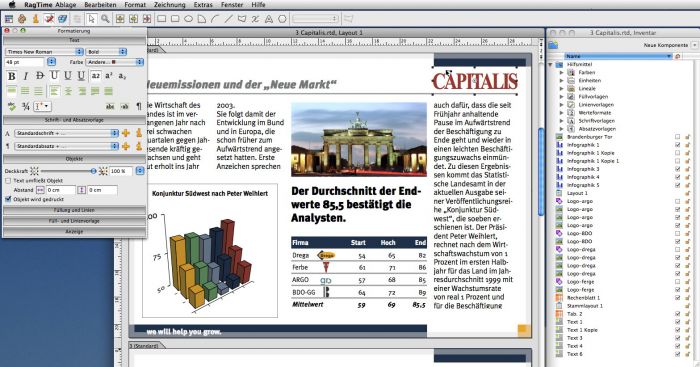 Il pacchetto, lo ricordiamo, è una combinazione tra un pacchetto di desktop publishng, prepress, office e database publishing.: una combinazione integrata di word processor, foglio elettronico, e sistema per la gestione dei layout particolarmente adatto per ambienti nei quali è necessario creare report con grafici e diagrammi da tenere aggiornati in modo semplice e veloce. Ogni elemento della pagina può essere ruotato, scalato, trascinato. Elementi quali immagini e testi possono fluire sulle celle di una tabella mantenendo il completo controllo poiché ogni elemento ha una finestra di editing dedicata. Funzioni aritmetiche possono essere facilmente applicate a tabelle, testi, grafici e controllare interattivamente form e documenti. Non mancano funzioni per il controllo ortografico multilingua e per la verifica della corretta indentazione.