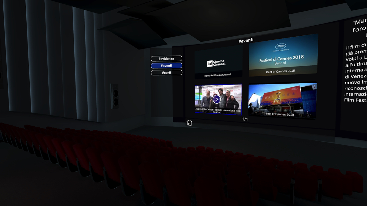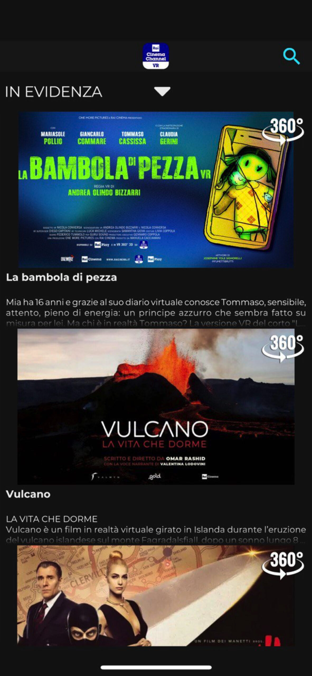 In anticipo sui tempi RAI è stata la prima società media a rilasciare l’app Cinema Channel VR di realtà virtuale interamente in Italiano già nel 2019: con l’ultimo aggiornamento l’app è stata completamente rinnovata, offre oltre 100 contenuti esclusivi per la visione in modalità lineare oppure a 360 gradi, tutto questo non solo per smartphone iPhone e Android, ma anche per i visori Oculus Quest 2 e prossimamente anche nello store PICO.