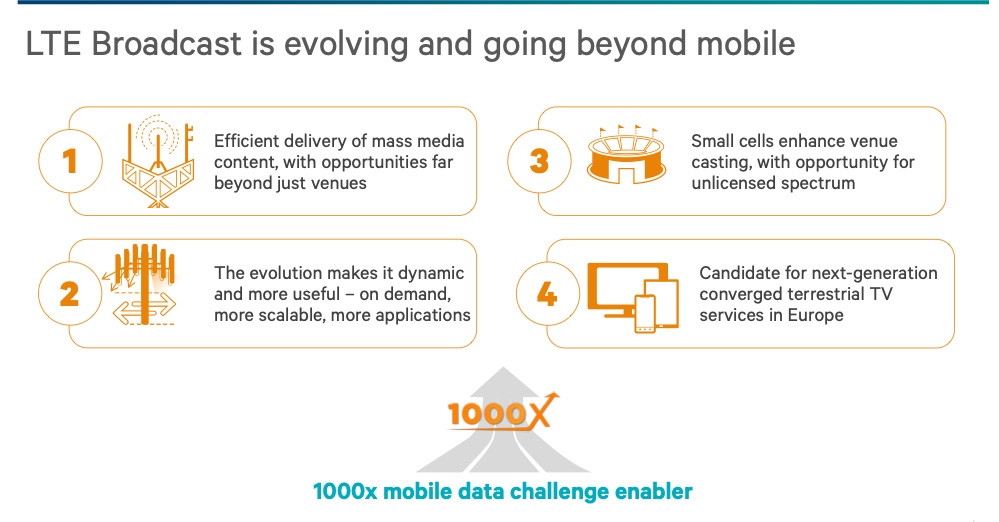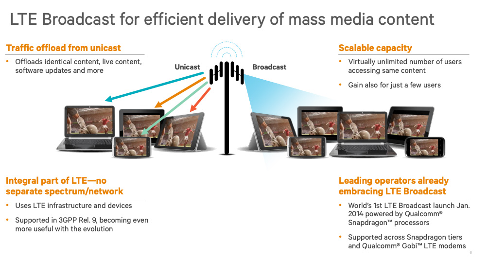 Il 5G Broadcast deriva dall’LTE Broadcast di Qualcomm (PDF), tecnologia che promette di rivoluzionare la fruizione di contenuti video in mobilità e la fruizione contemporanea a più utenti di grandi quantità di dati.