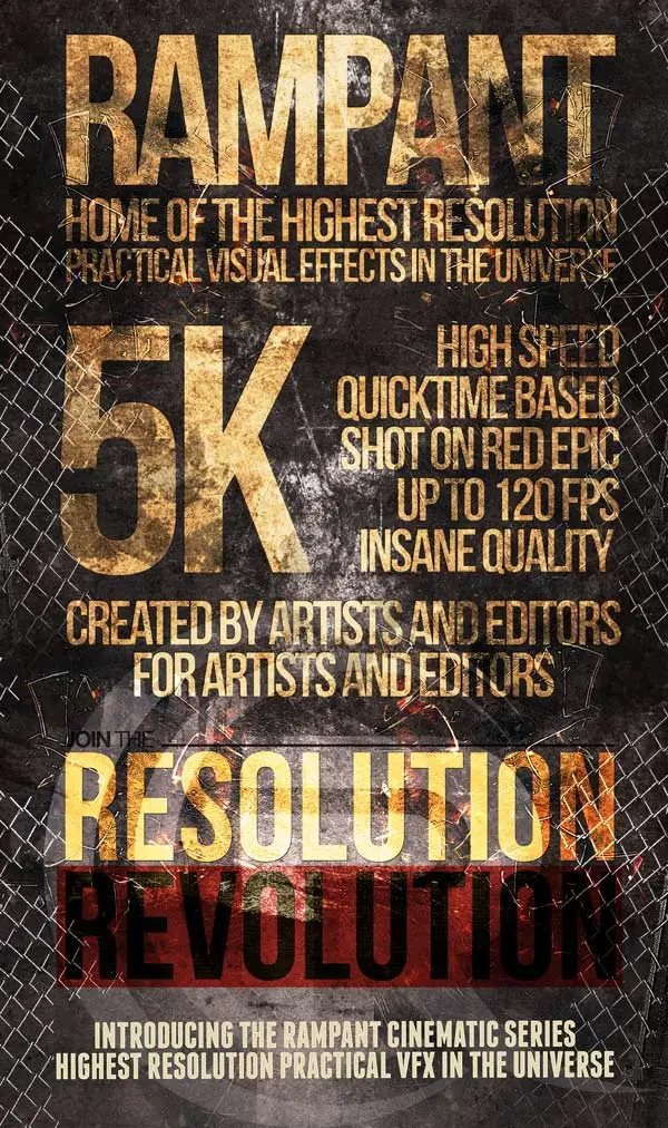 Rampant Design, società statunitense che propone a chi lavora con software di editing video librerie di clip, effetti speciali, plug-in e texture animati, probabilmente per differenziarsi da altri produttori simili propone Rampant Cinematic Series, clip con risoluzione 5K (5120 x 2700 pixel).