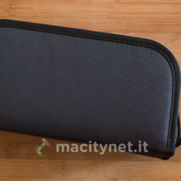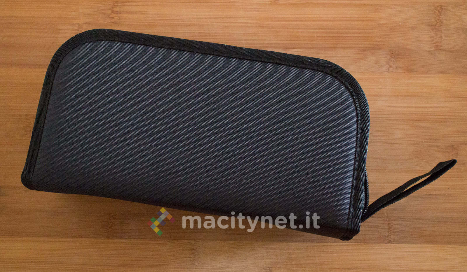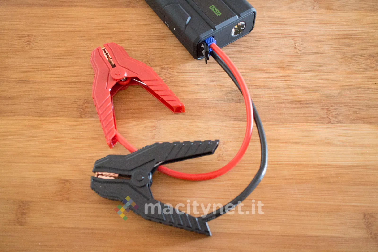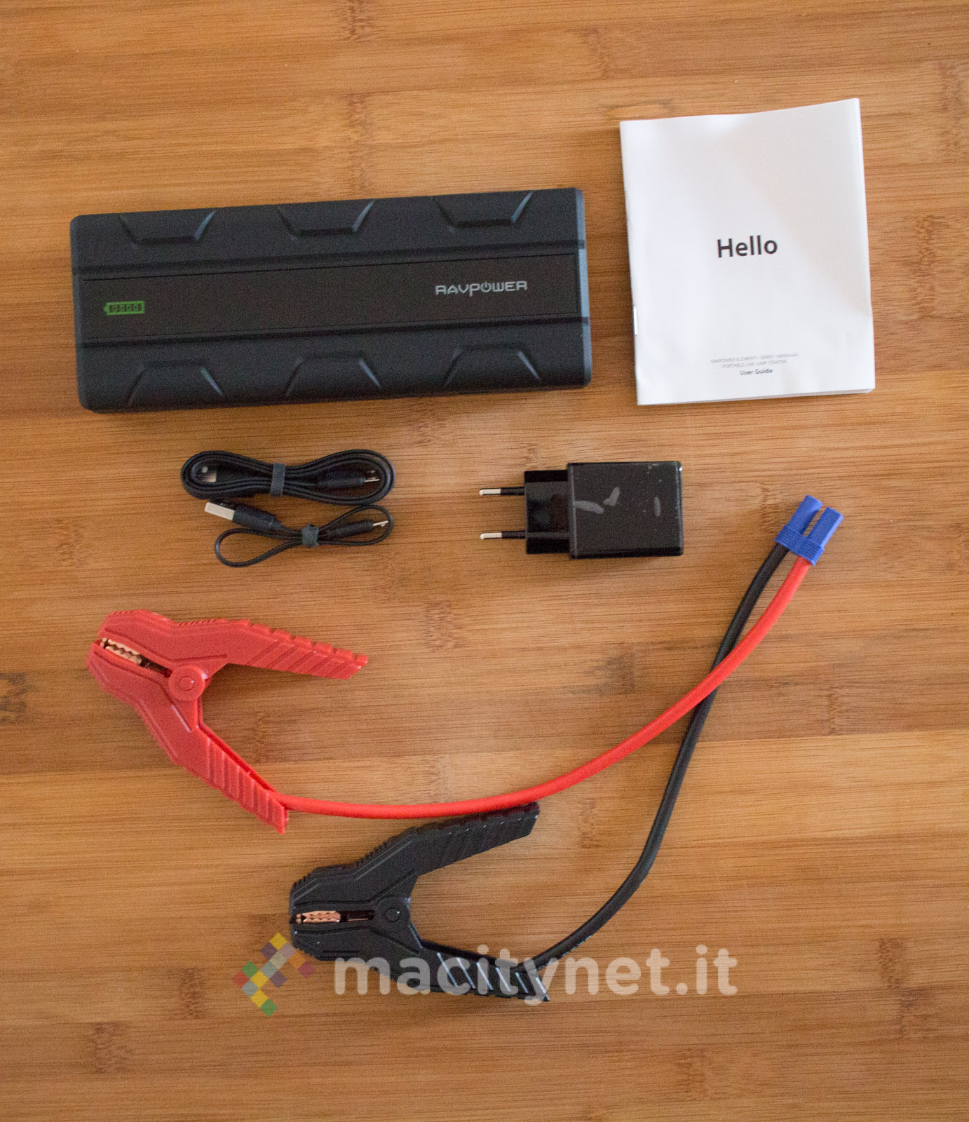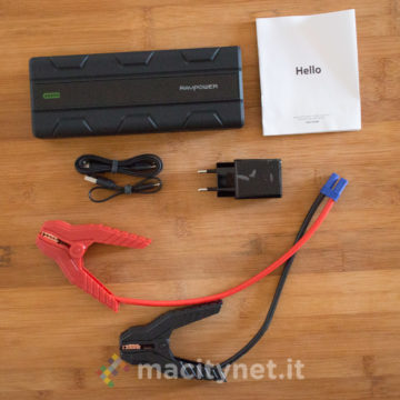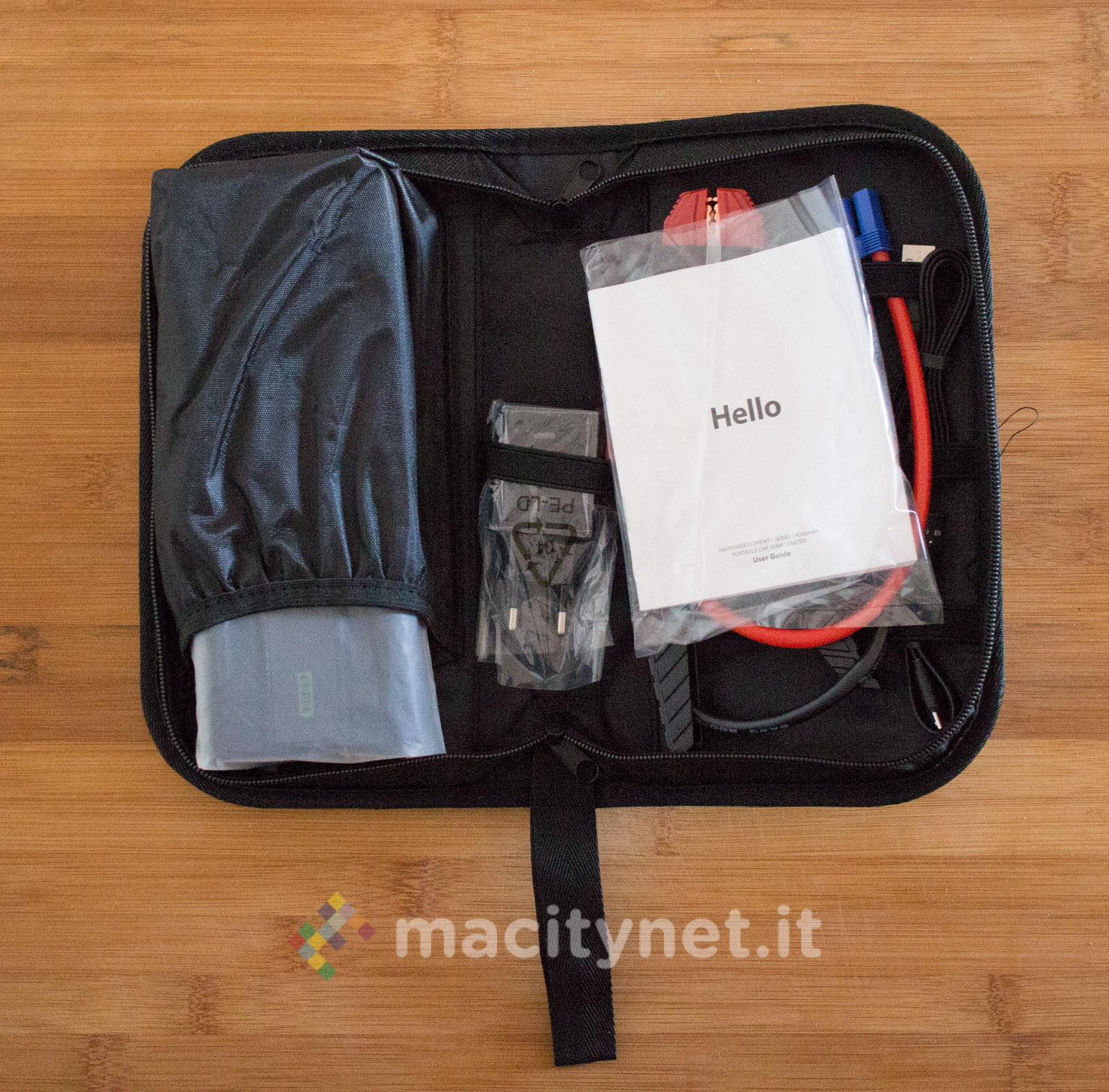 La batteria è riposta all’interno di una valigetta semi-rigida in tessuto insieme ai cavetti con pinze per il collegamento alla batteria dell’auto, due cavi microUSB di diverse lunghezze ed un caricatore da muro.