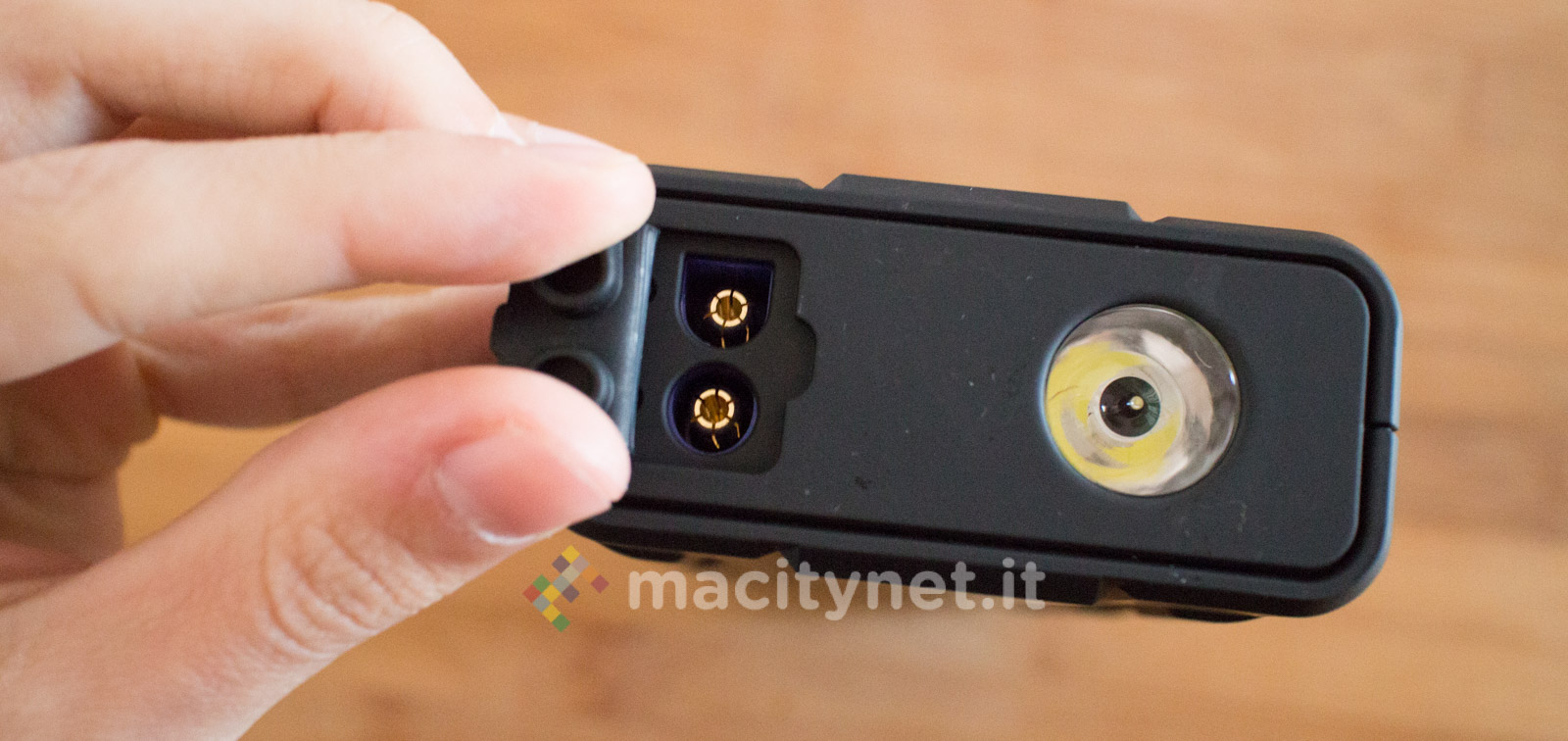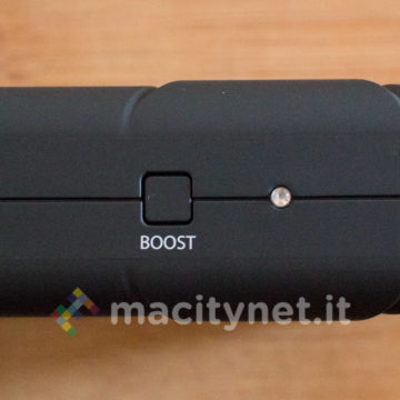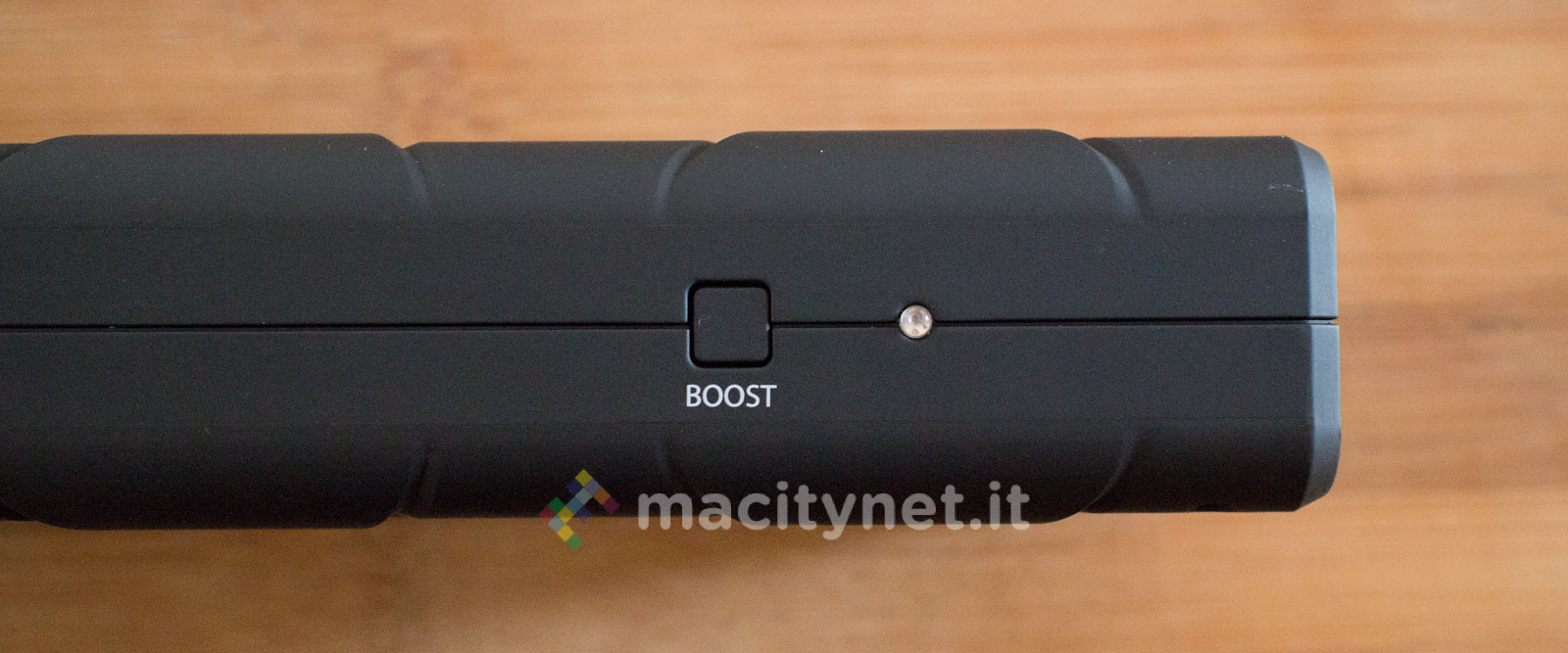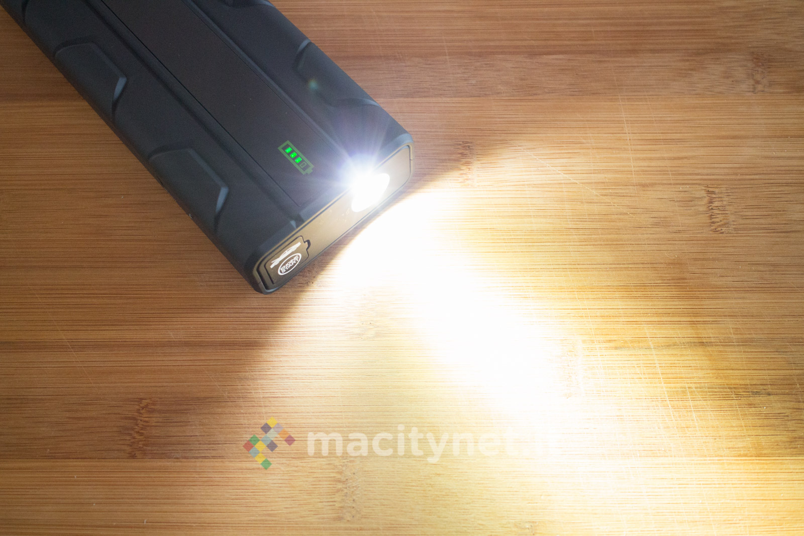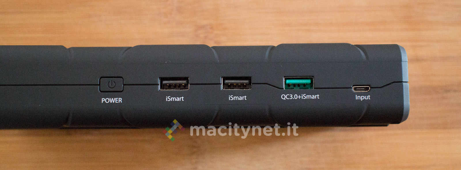 Il corpo della batteria è davvero massiccio, molto robusto e apparentemente capace di resistere anche ad una eventuale caduta di qualche decina di centimetri. Su uno dei due lati corti è incassata la torcia LED, su un lato lungo troviamo un indicatore LED ed il pulsante di Boost, dall’altro invece l’ingresso microUSB, il tasto ON/OFF e tre prese USB-A, di cui una riconoscibile per il colore verde e dotata di tecnologia Quick Charge.