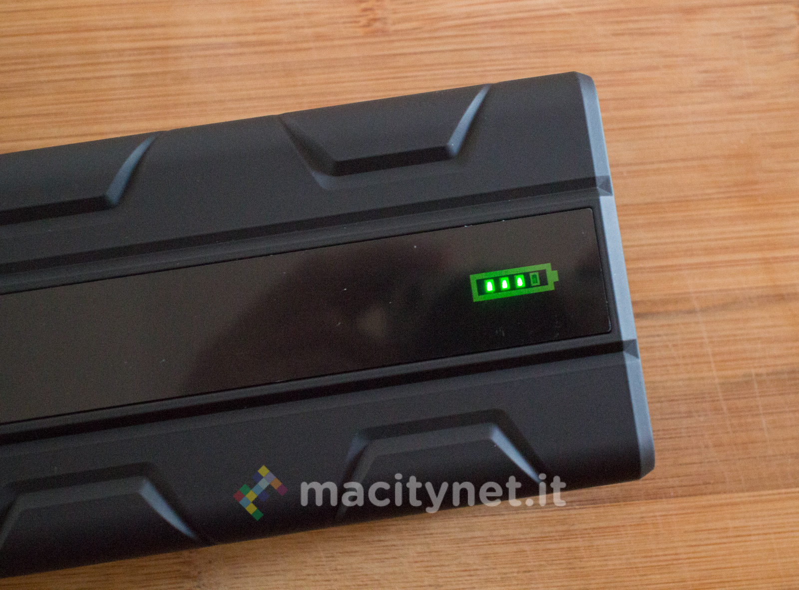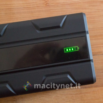Non è una di quelle batterie d’emergenza che porterete in borsa o nella tasca dei pantaloni tutto il giorno, questo perché peso e dimensioni non la rendono certamente una soluzione tascabile. Della sua capacità, di 14.000 mAh, troverete sicuramente batterie più portatili, se il vostro obiettivo è unicamente quello di ridare energia a smartphone e tablet in mobilità.
