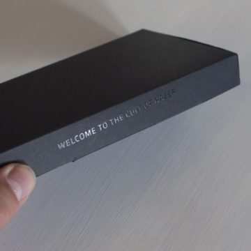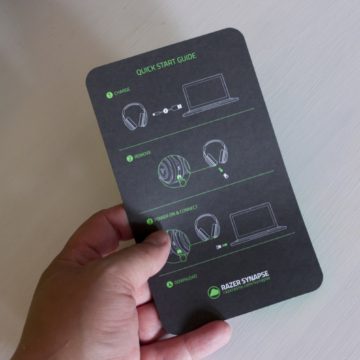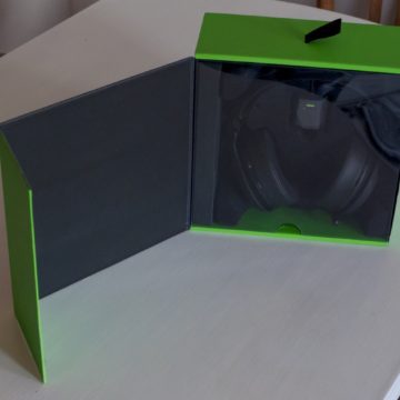 Le cuffie arrivano come sempre in una confezione molto bella: la semplicità del cartone è impreziosita dagli adesivi Razer e da uno strato di plastica trasparente che protegge le cuffie dalla polvere durante l’attesa in negozio. Una volta fuori il prodotto è molto bello: una fascia di plastica lucida è accompagnata da due opache, che accompagnano i padiglioni circumaurali, snodabili, dove una griglia racchiude il centro con il marchio Razer.