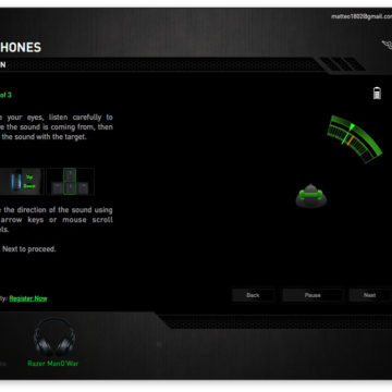 Le cuffie, lo ricordiamo, grazie ai driver Synapse permettono una simulazione dell’audio in modalità stereo e 7.1 (sempre che la sorgente lo permetta): già in fase di calibrazione la simulazione offre un impatto interessante, non certo come un sistema reale ma dato che si tratta di un paio di cuffie di sicuro sorprendente.