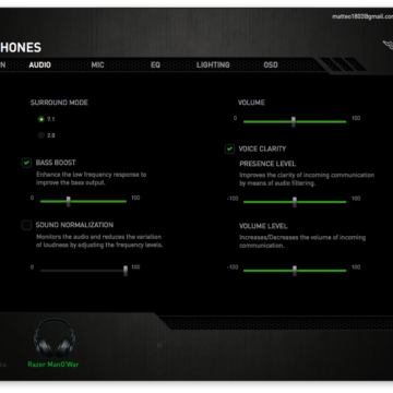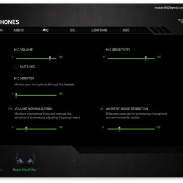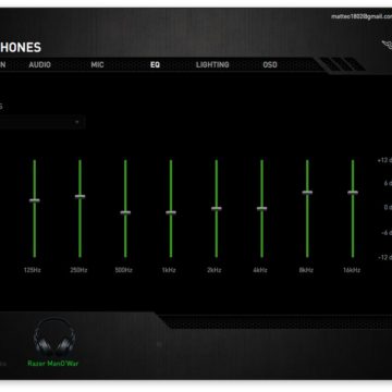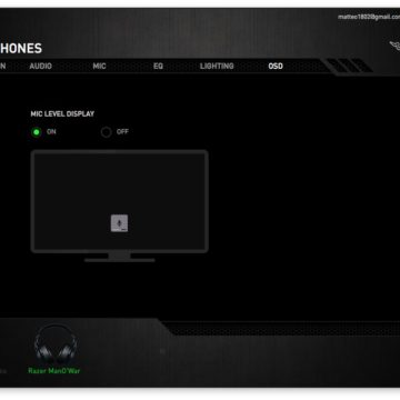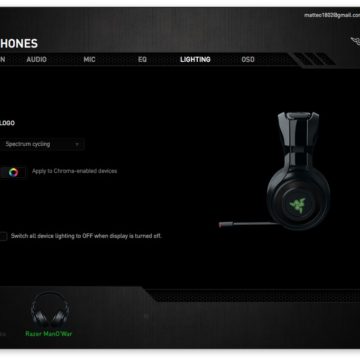 Synapse permette anche di controllare l’illuminazione presente nel marchio Razer dei padiglioni tramite tre set diversi (più un quarto, spento): ciclo colori, due colori distinti oppure uno fisso, a piacere, offrono un effetto davvero importante specie al buio e specie se avete già altri device Razer come mouse o tastiere. che è possibile sincronizzare.